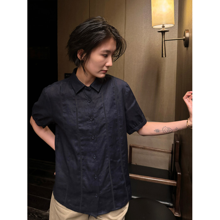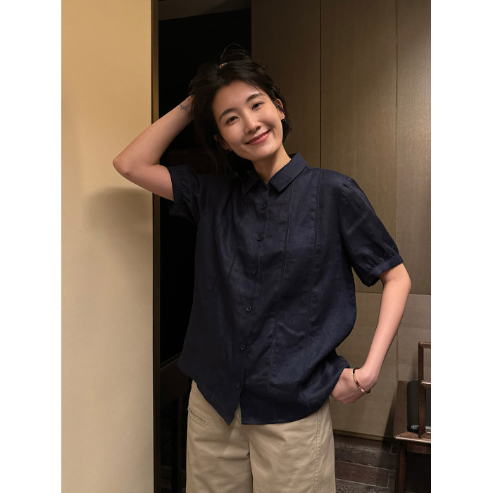 周浪清藏青色亞麻短袖襯衫女夏季2025新款小個子休閒寬松薄款襯衣