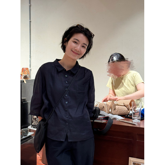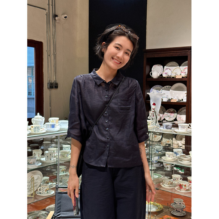 周浪清藏青色短袖苧麻襯衫女款2025新款夏季薄款襯衣休閒寬松上衣