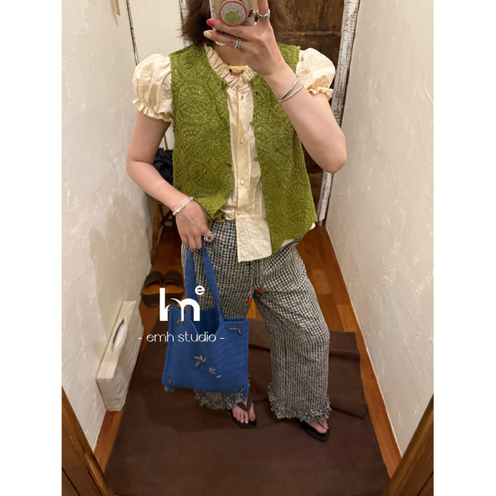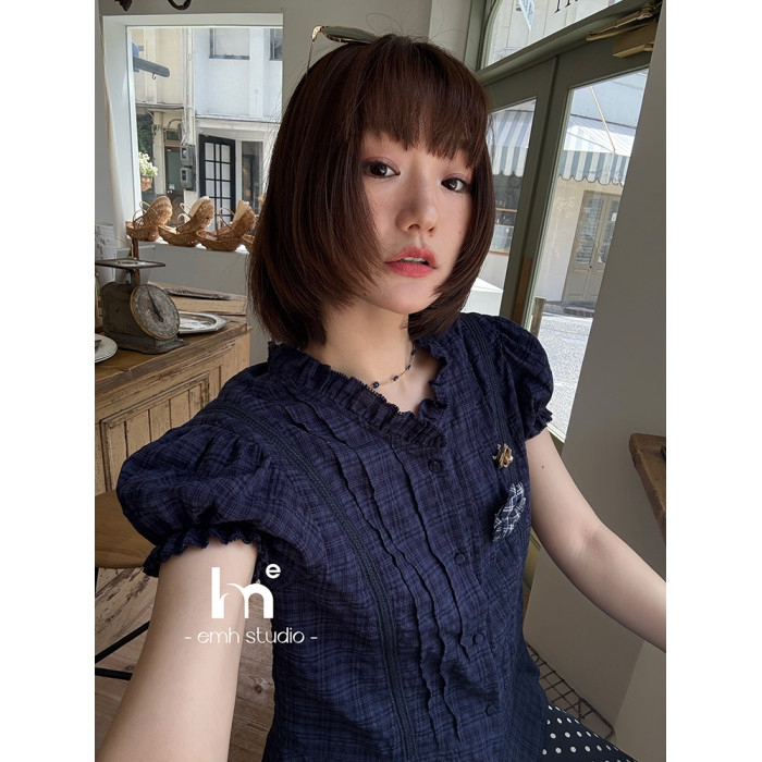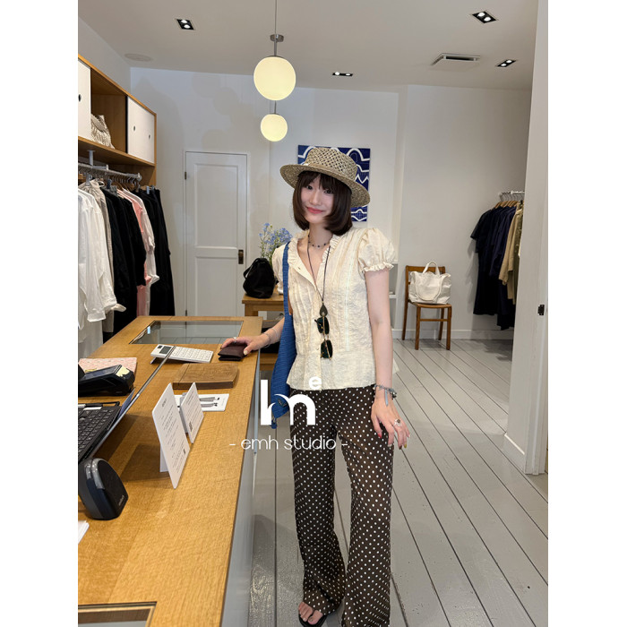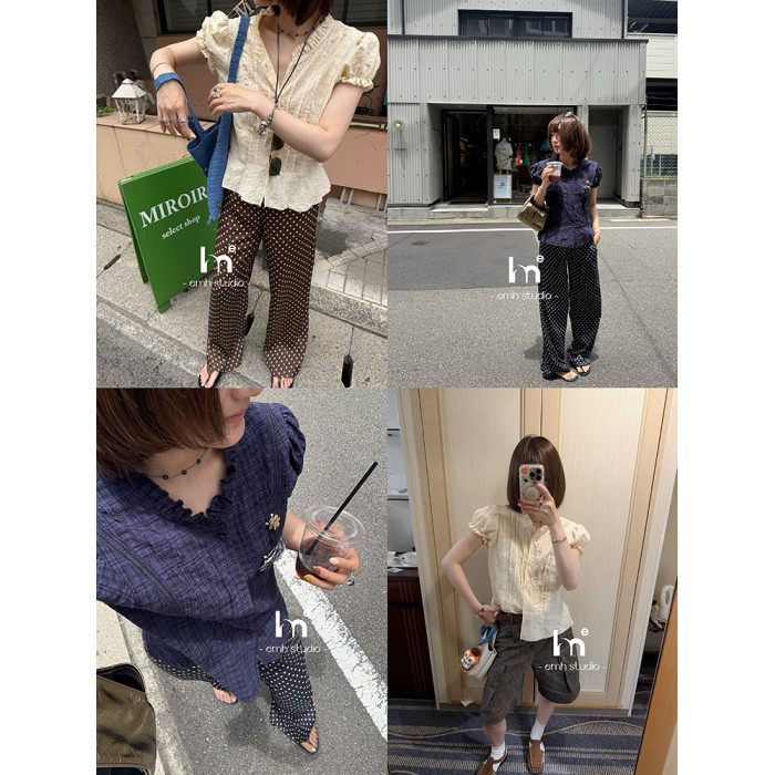 EMH 復活添新色 睫毛綉花邊暗格紋鹽縮泡泡袖單排釦收腰短袖襯衫