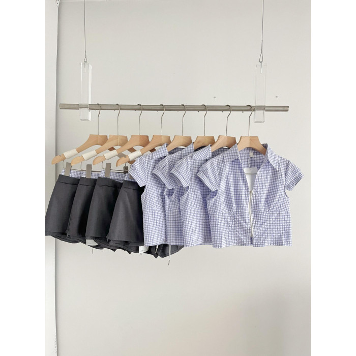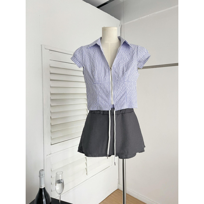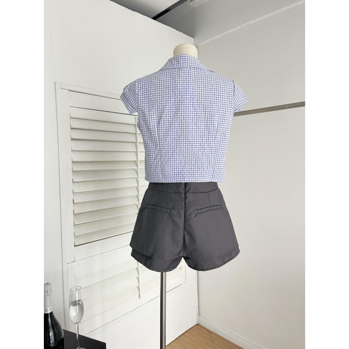 夏季新款韓系簡約休閒通勤風穿搭格紋短款襯衫灰色西裝裙褲兩件套