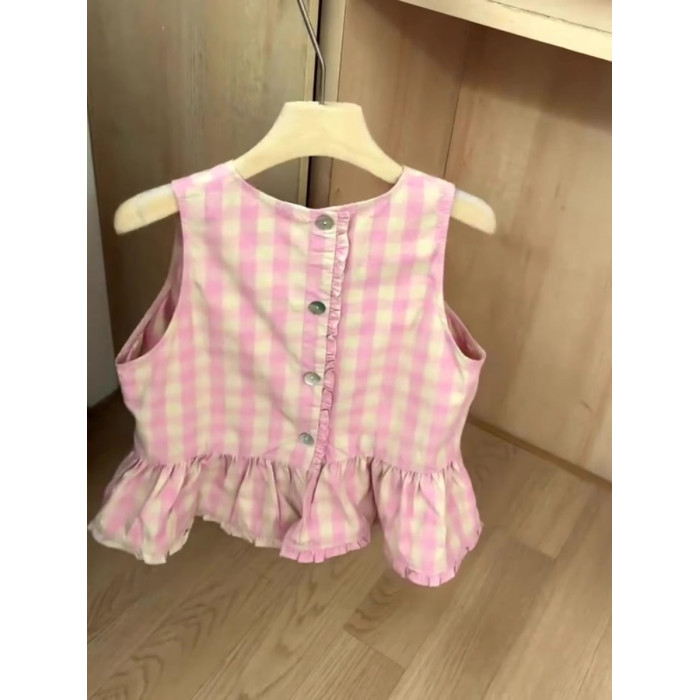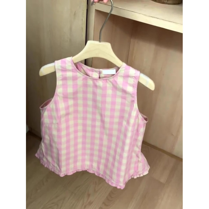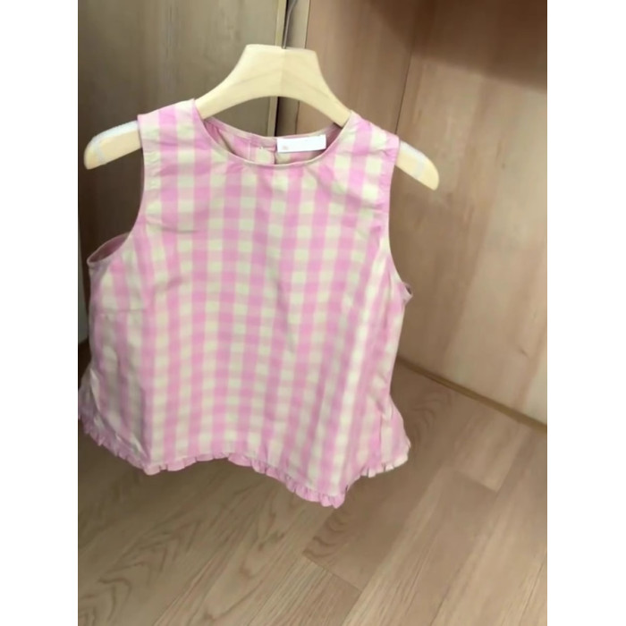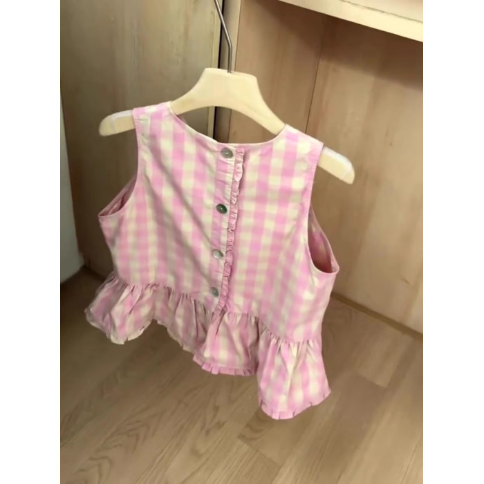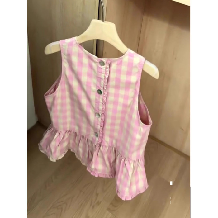 推薦!巨好看~粉色格子無袖背心襯衫女夏季荷葉邊減齡短袖上衣潮