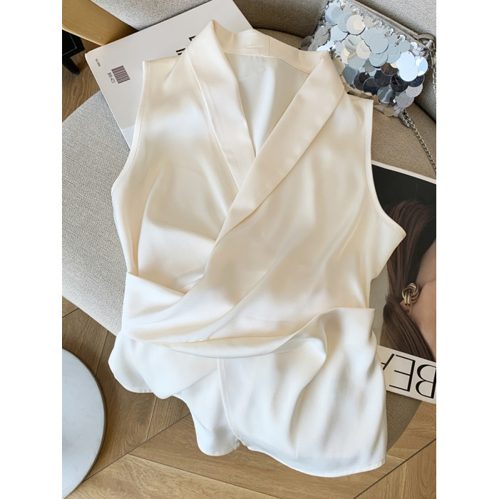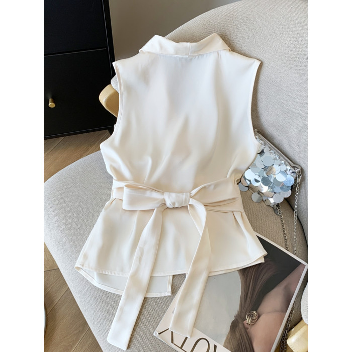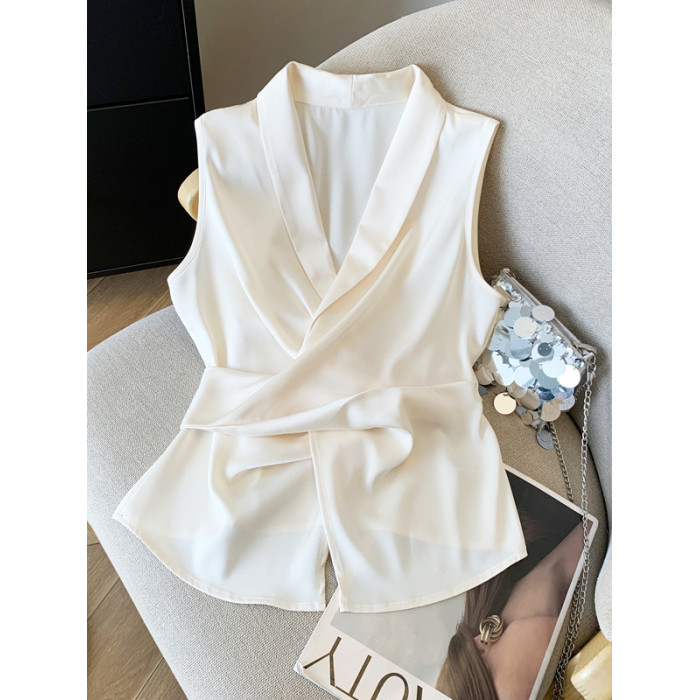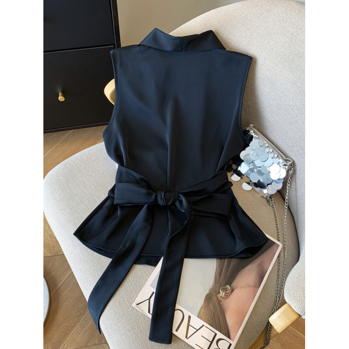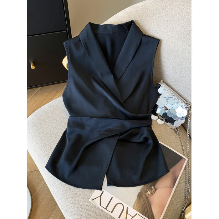 氣質緞面收腰無袖襯衫2025夏季新款設計感交叉綁帶時尚背心上衣潮