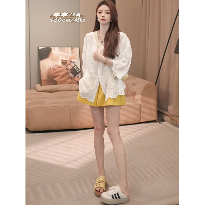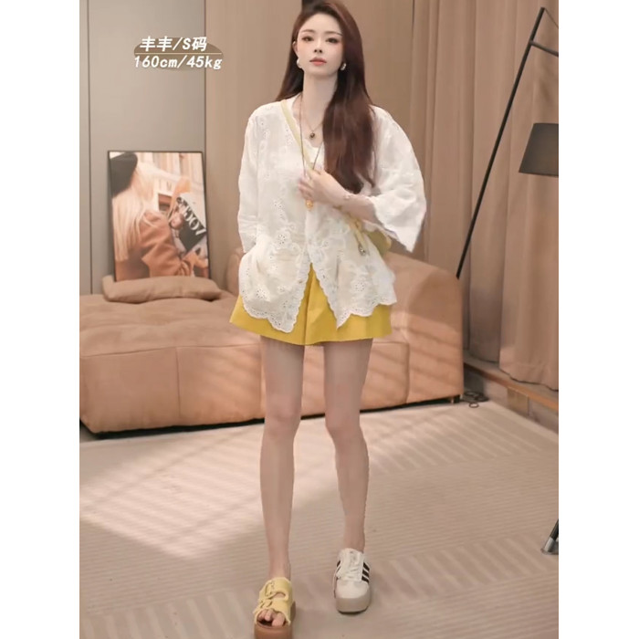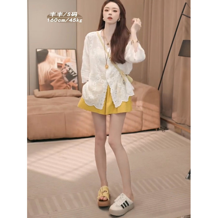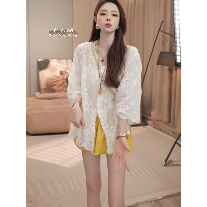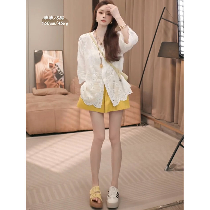 巨好看的早秋一整套設計感V領鏤空七分袖防曬襯衫+高腰短褲兩件套