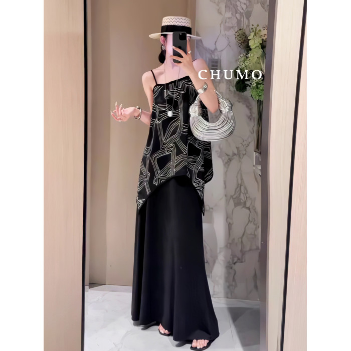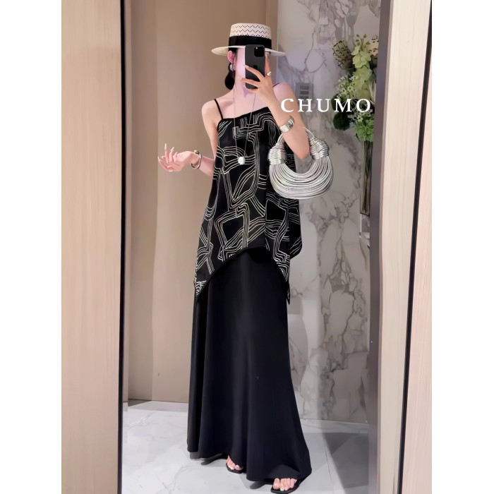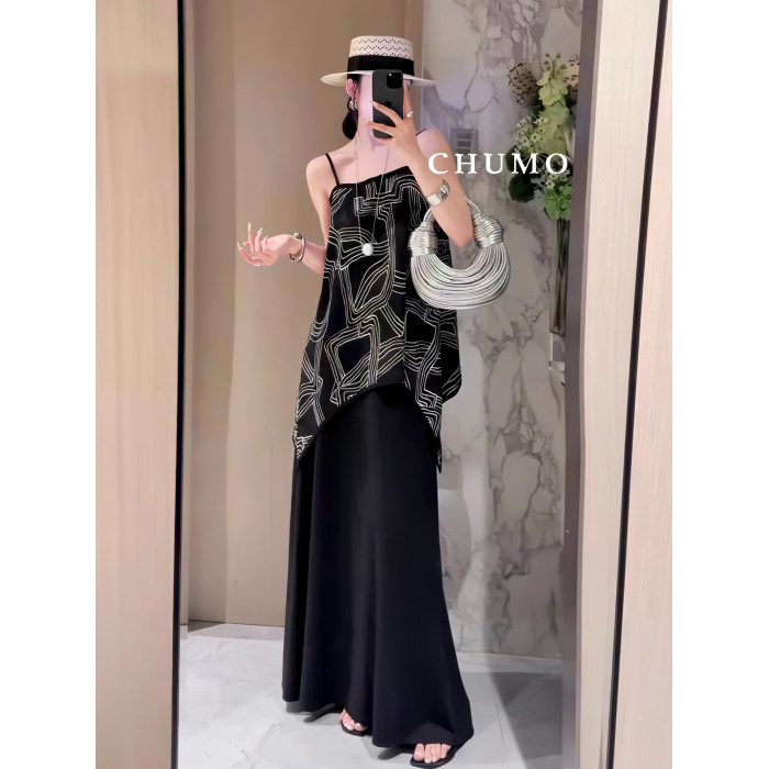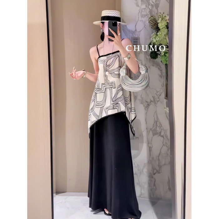 韓版老錢風寬松幾何條紋吊帶背心襯衫上衣高腰半身裙時尚兩件套