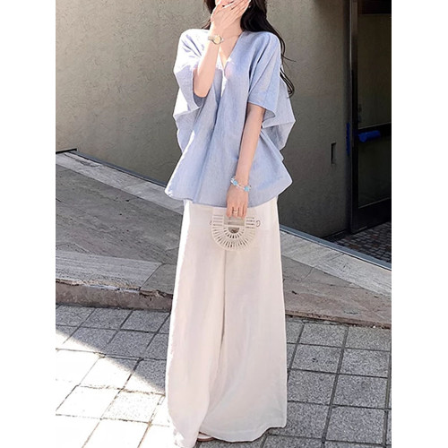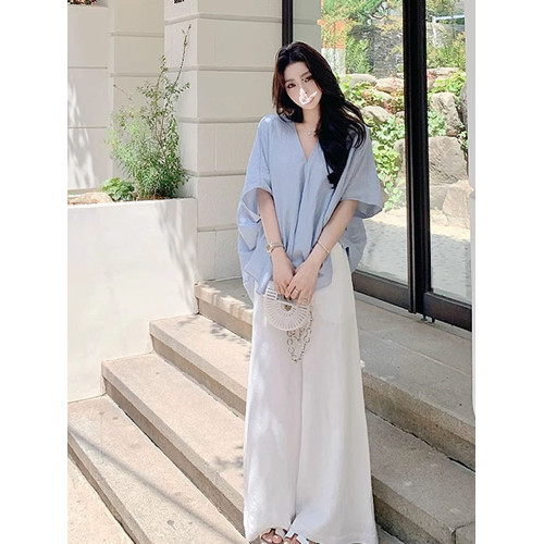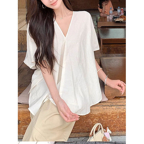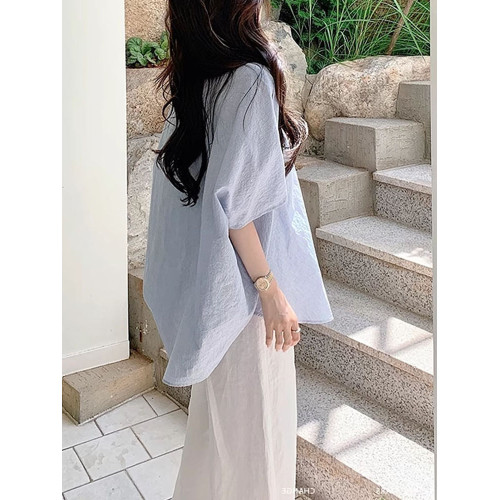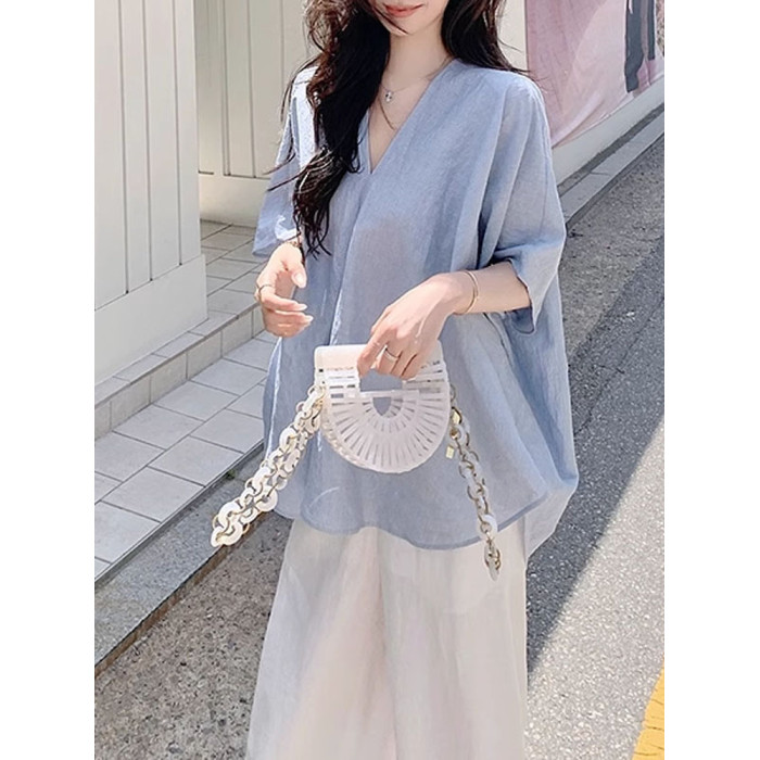 "度假老錢衫"亞麻棉襯衫女松弛感V領小衫夏季寬松百搭蝙蝠袖上衣