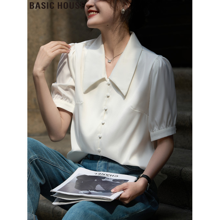 Basic House/百家好白色短袖襯衫女士夏季2025新款法式泡泡袖上衣