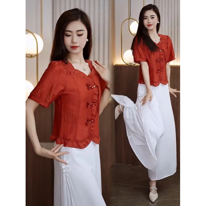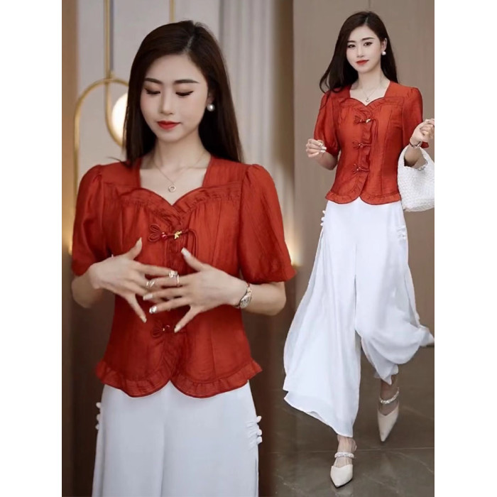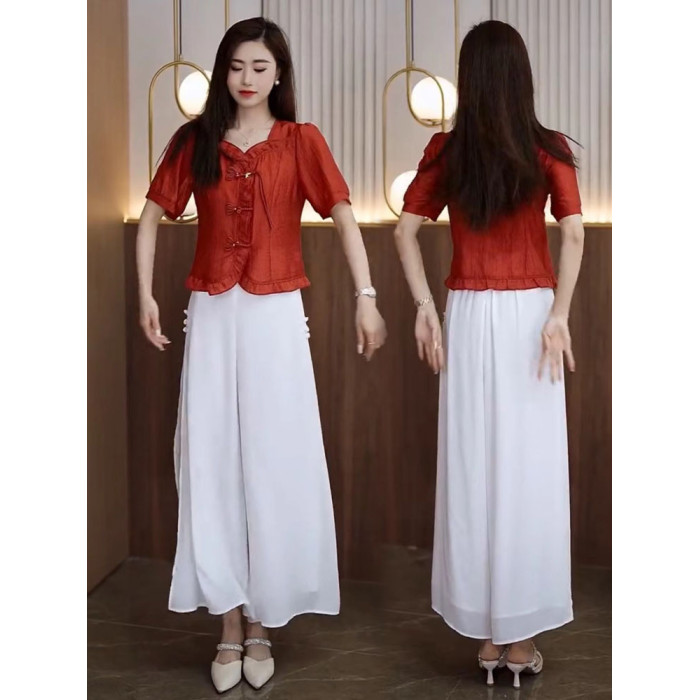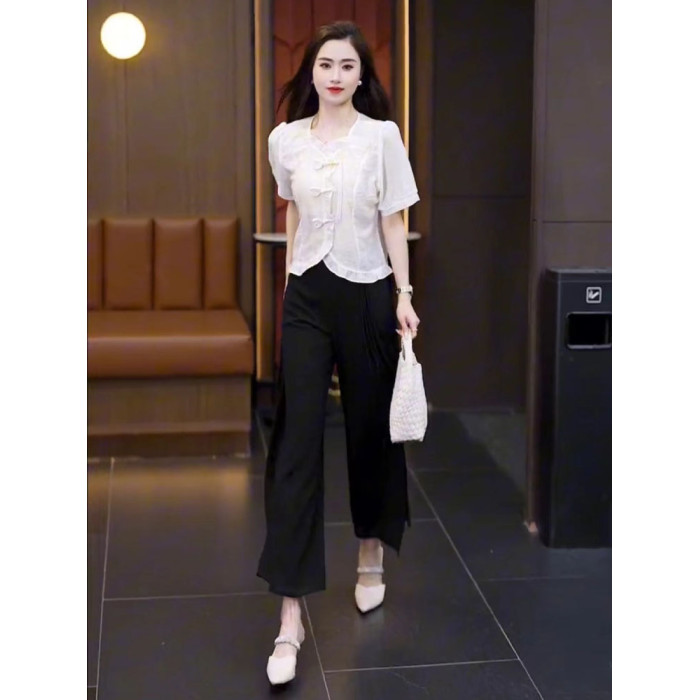 濶腿裙褲套裝女夏季高級感穿搭雪紡上衣短袖氣質時尚顯瘦短款襯衫