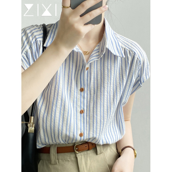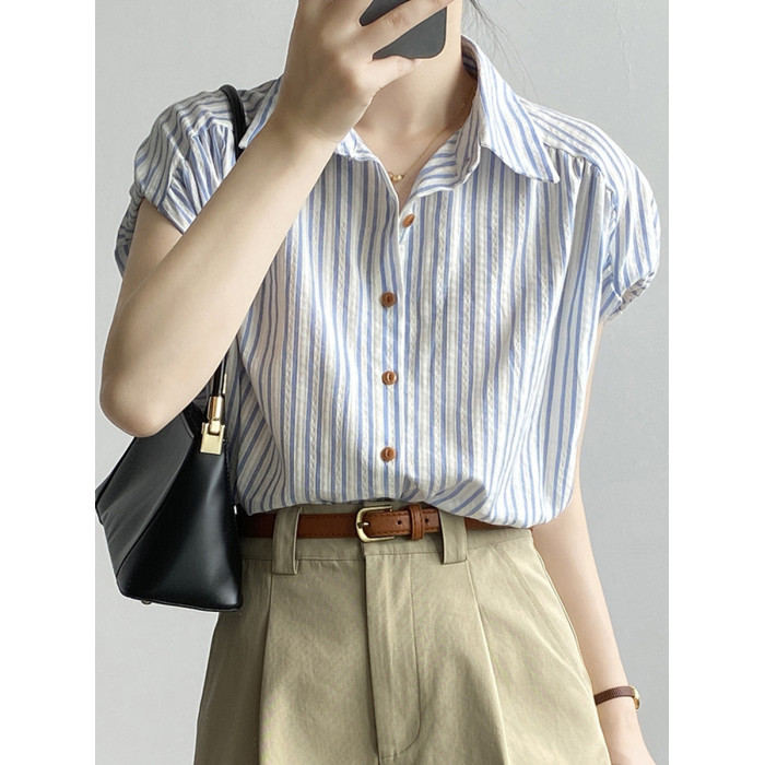 竪條紋飛飛袖襯衫女2025夏季新款短袖polo領淺藍色上衣小個子襯衣