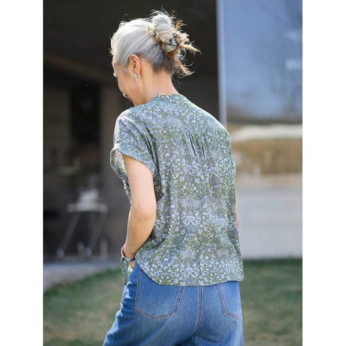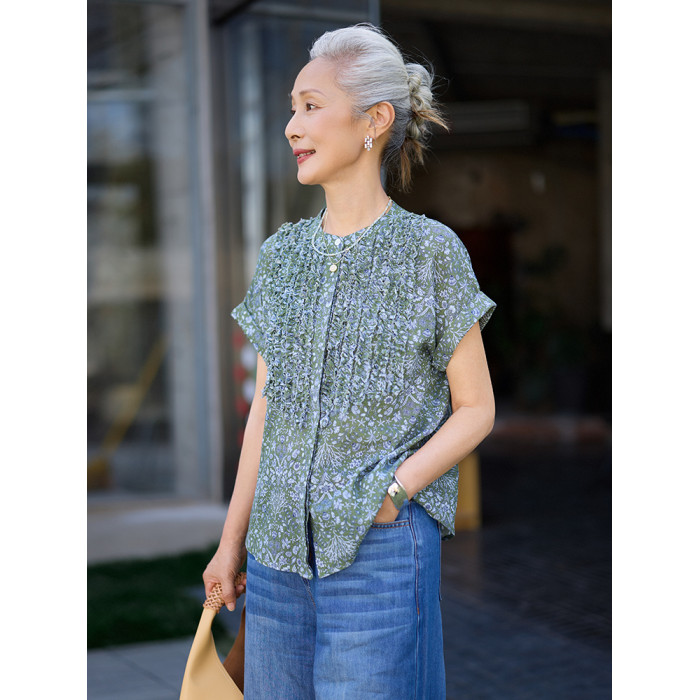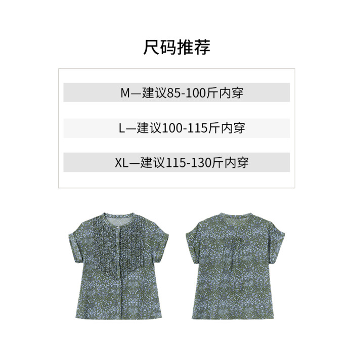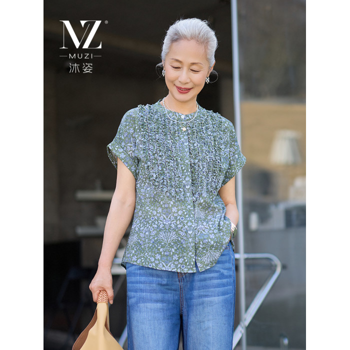 沐姿【純棉】中年媽媽夏裝T恤薄上衣中老年女裝短袖全棉碎花襯衫