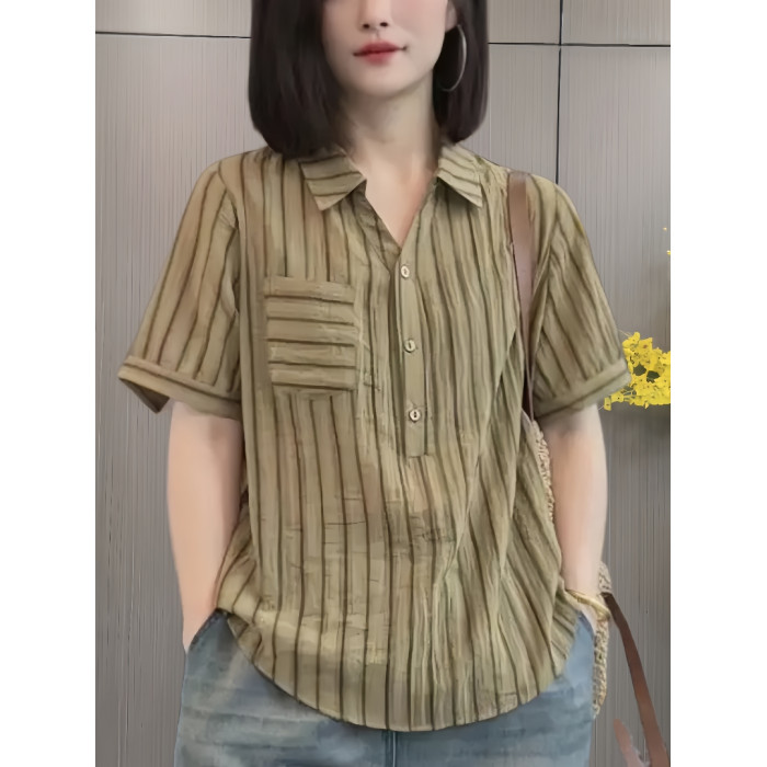 洋氣翻領條紋天絲棉麻襯衫女2025夏季媽媽短袖襯衣遮肚子顯瘦上衣