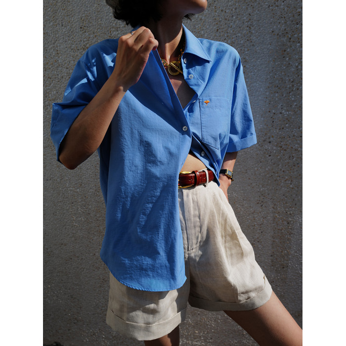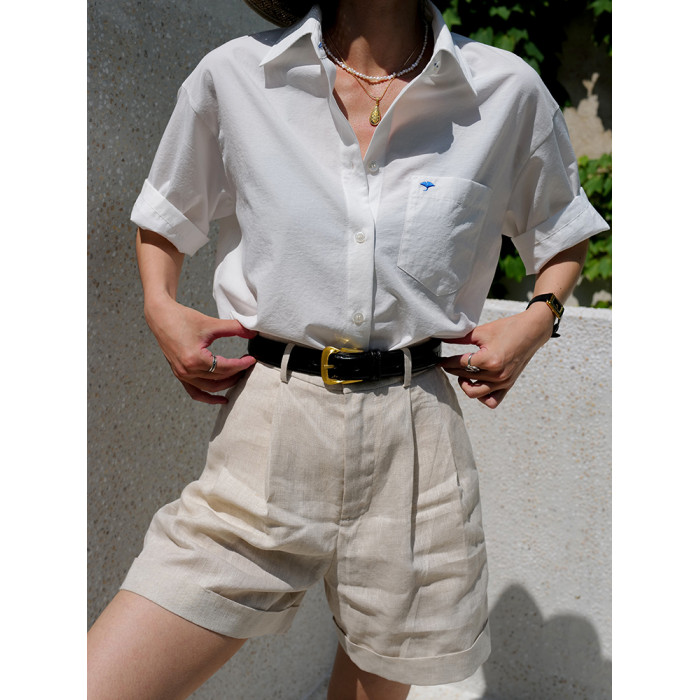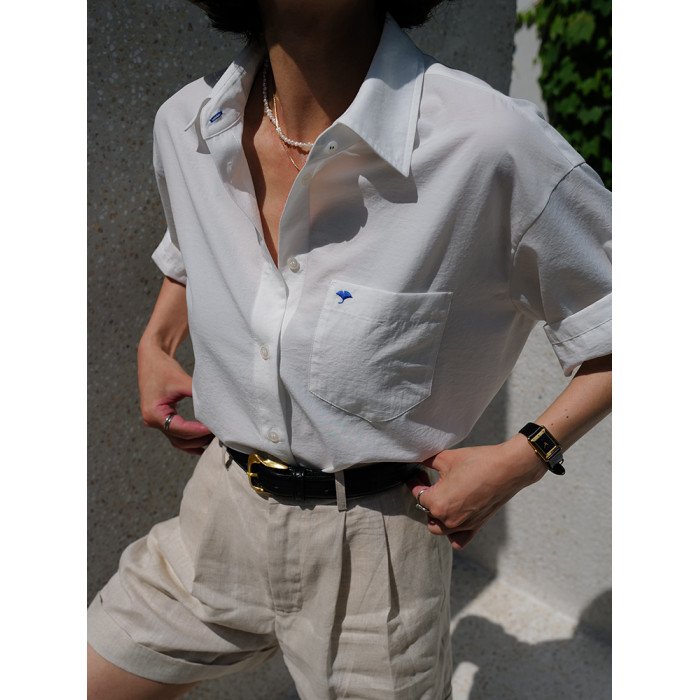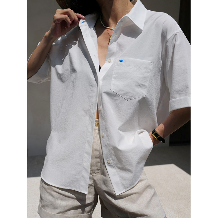 三所vintage 希臘藍方領刺綉白襯衫通勤進口抗皺短袖白襯衣女夏季