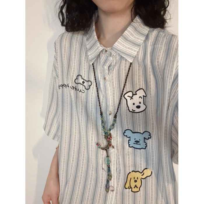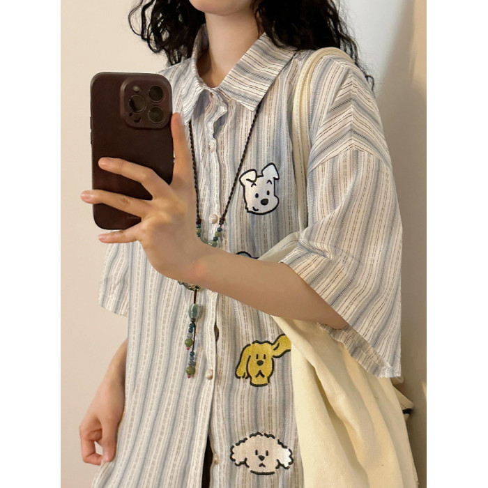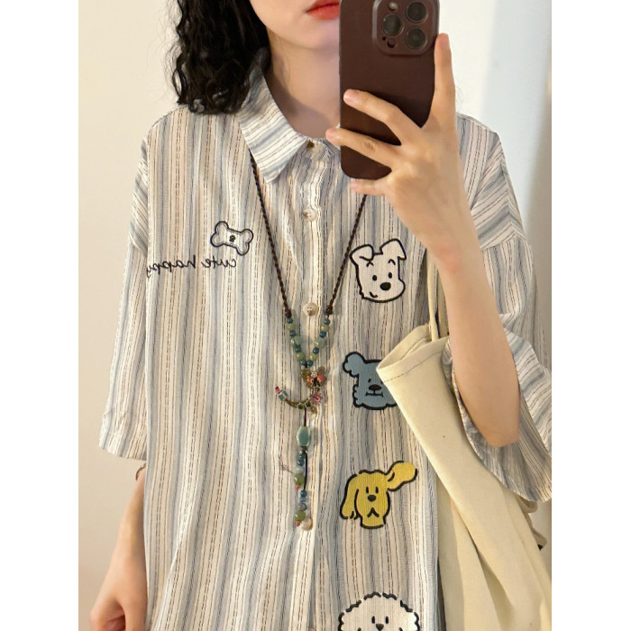 日系小狗刺綉亞文化短袖襯衫女夏季新款潮牌休閒寬松半袖條紋襯衣