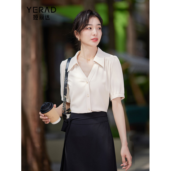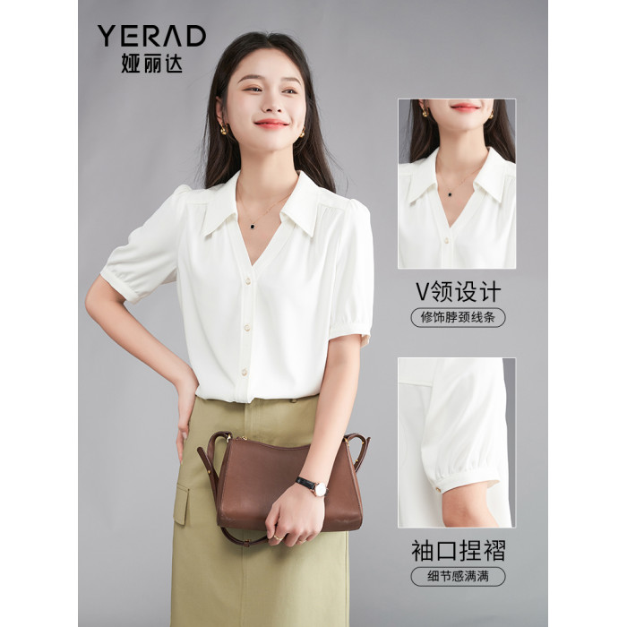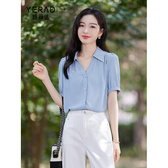 婭麗達高級感通勤藍色職業短袖襯衫女夏季2025新款大碼雪紡襯衣
