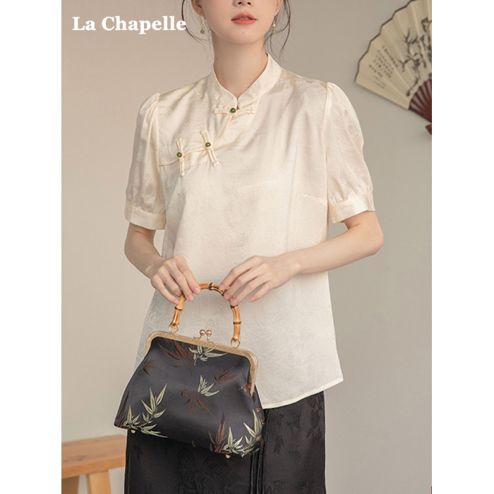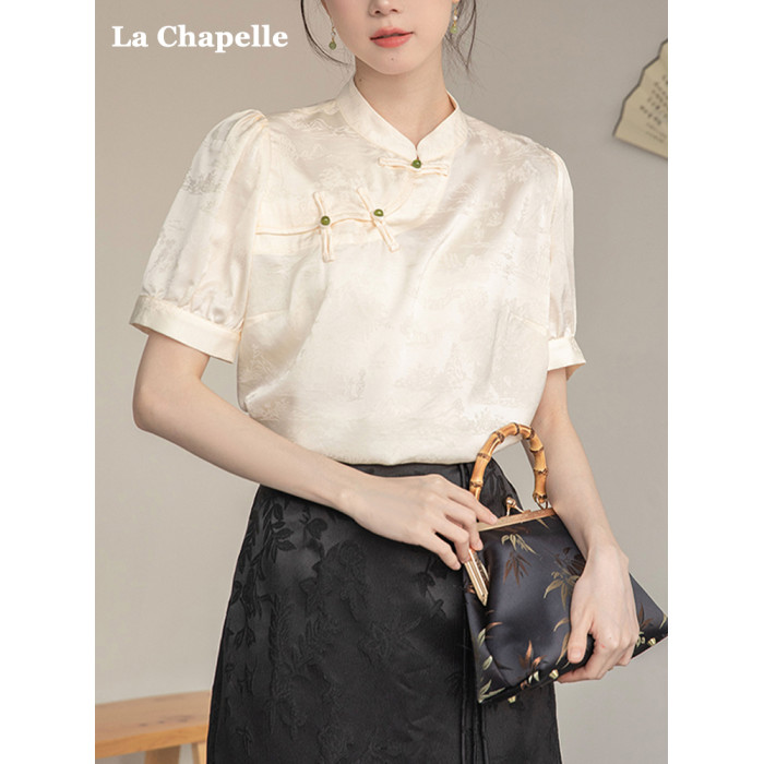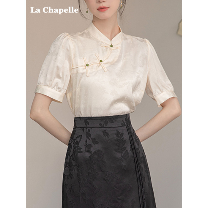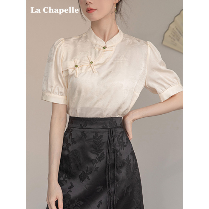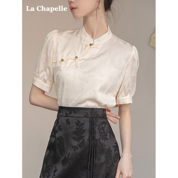 拉夏貝爾官方新中式短袖襯衫女2025夏新款設計感國風盤釦小衆上衣