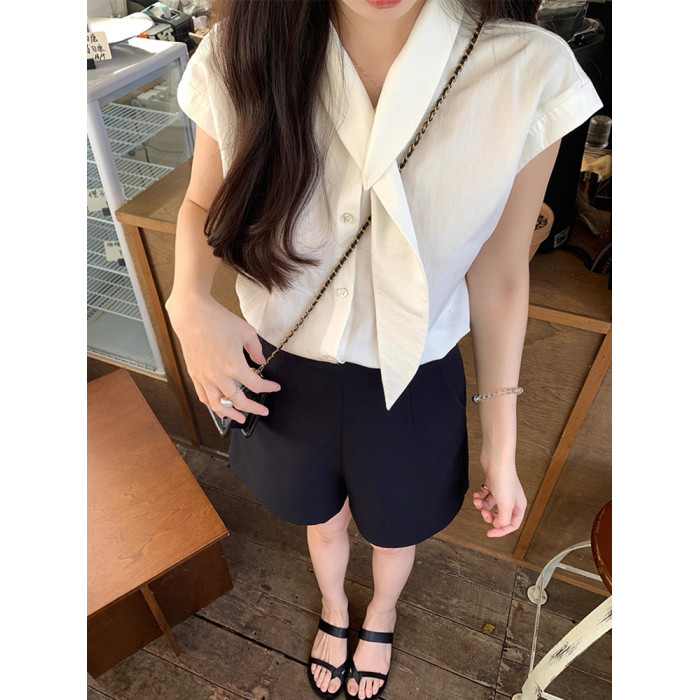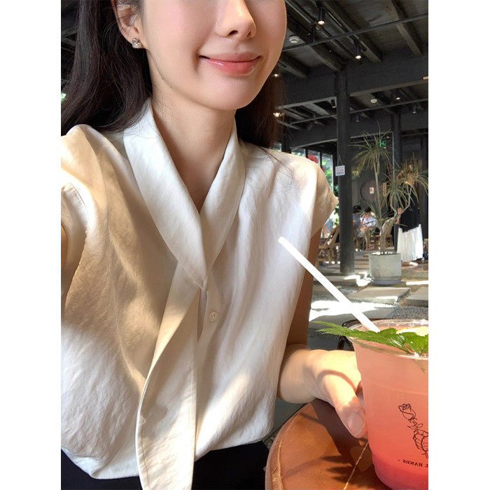 法式飄帶領甜美白色上衣女夏季裝新款小衆設計感休閒寬松顯瘦襯衫