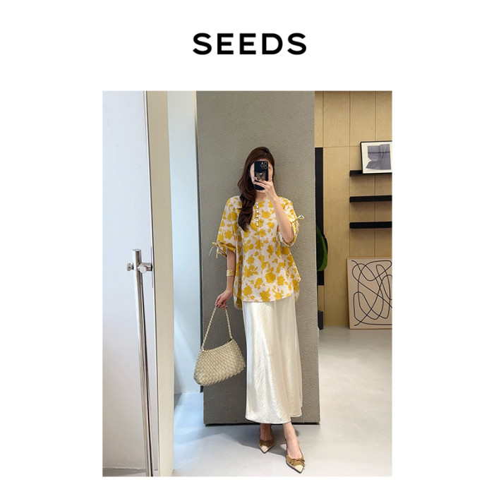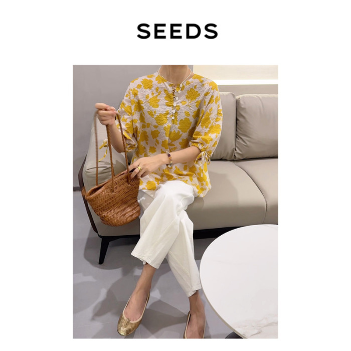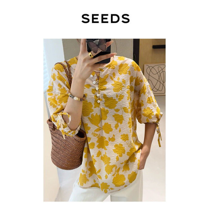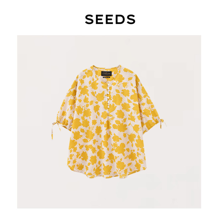 【梧桐疏影】SEEDS 日産輕薄鹽縮泡泡紗復古時髦剪影印花系帶襯衫