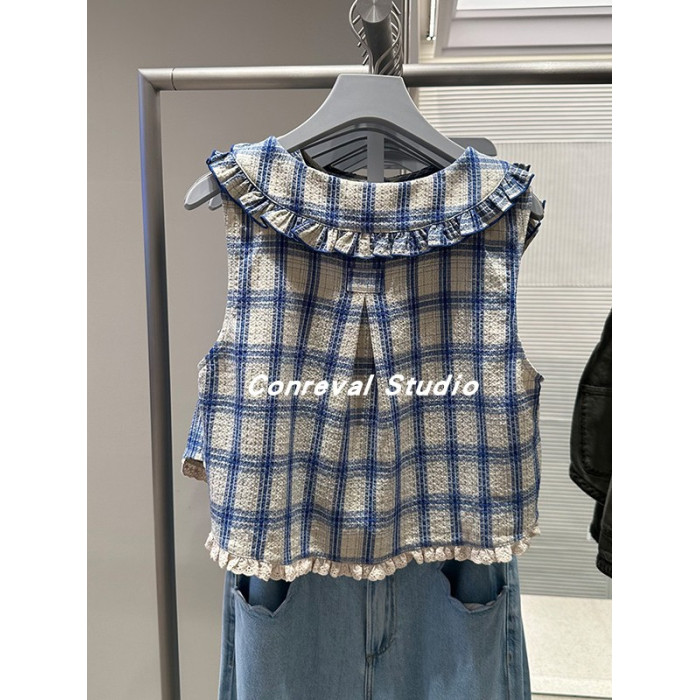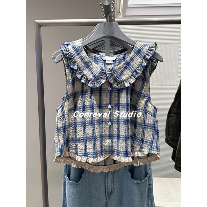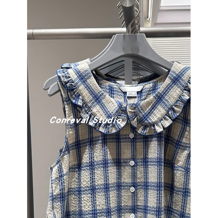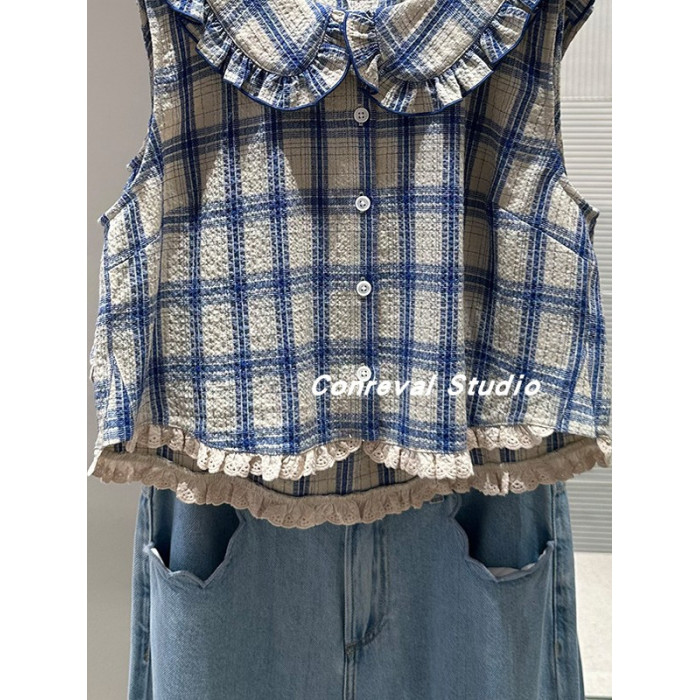 SH&UR2025夏季新款女甜美娃娃領撞色格紋拼接蕾絲開襟襯衫小個子