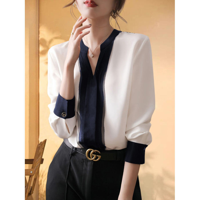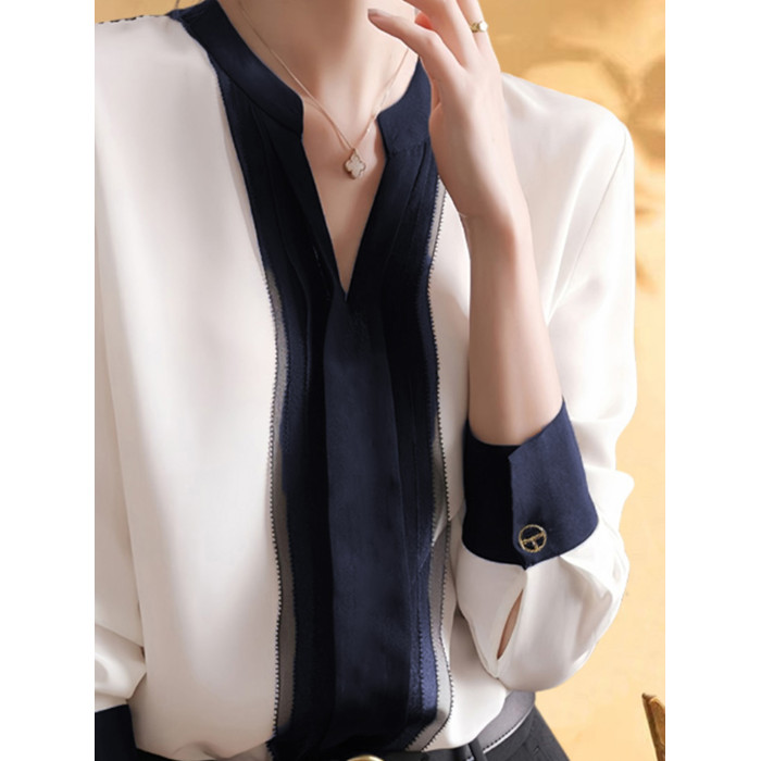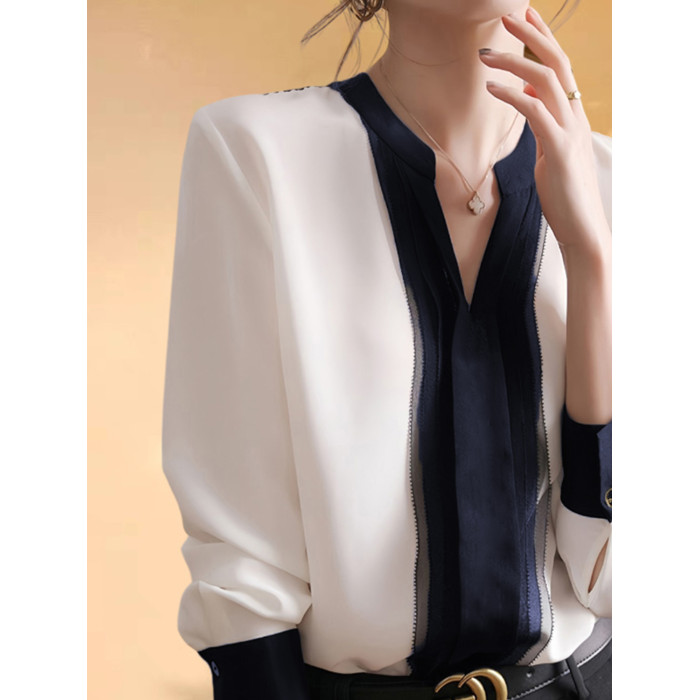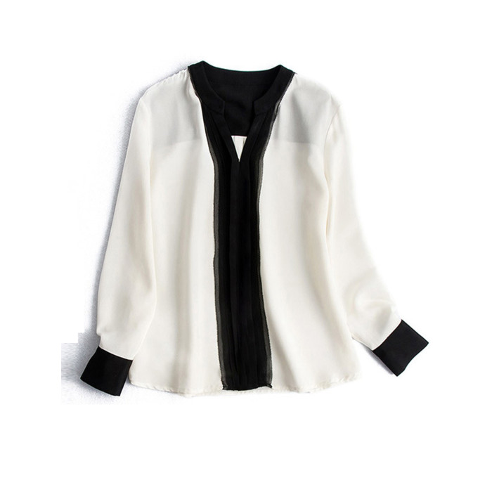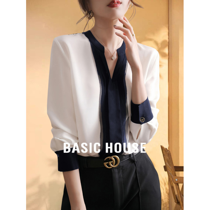 Basic House/百家好撞色V領雪紡襯衫女夏季網紗拼接輕熟打底襯衣