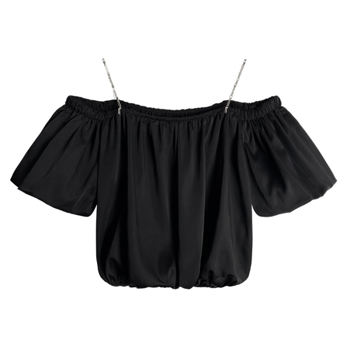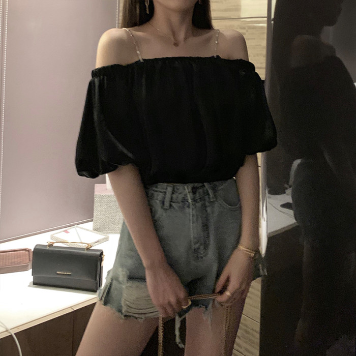黑色一字肩上衣女夏季鎖骨心機吊帶短袖露肩t恤泡泡袖短款襯衫潮