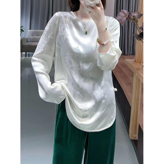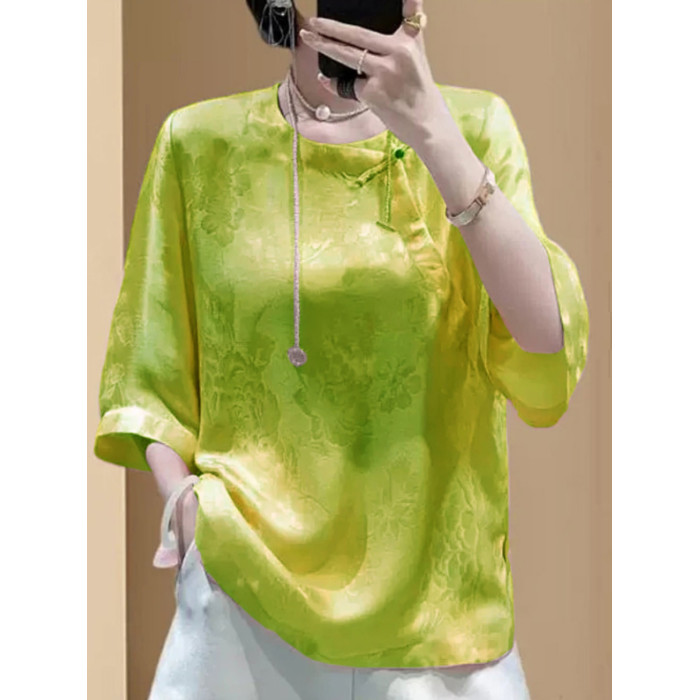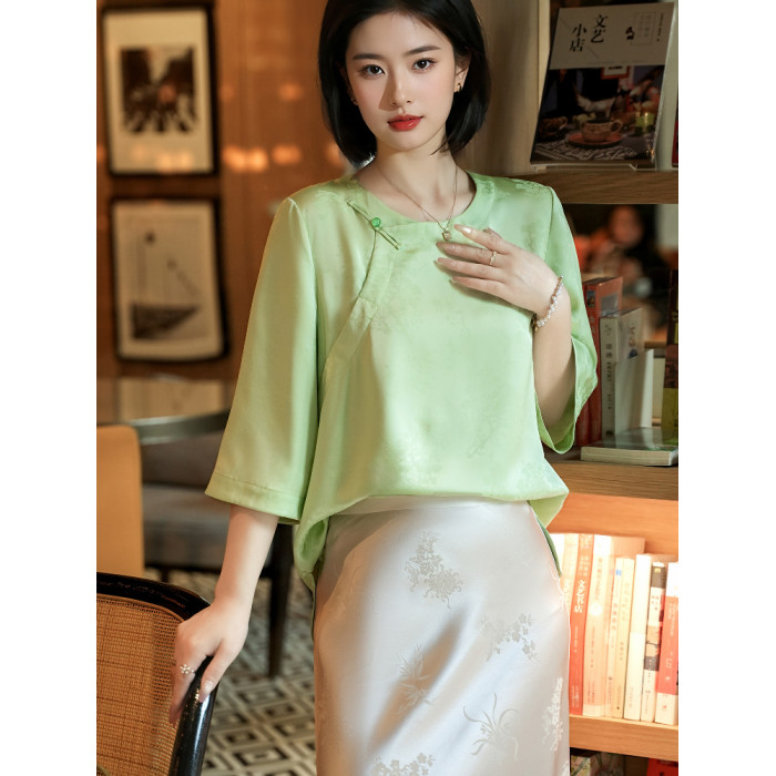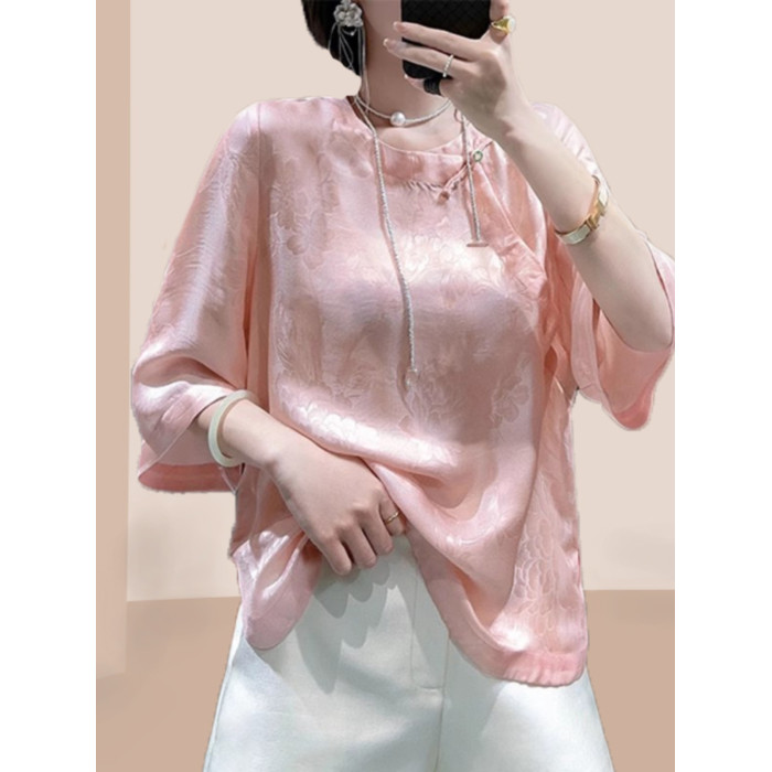 復古提花桑蠶絲襯衫女夏2025新中式盤釦襯衣減齡醋酸緞面短袖上衣