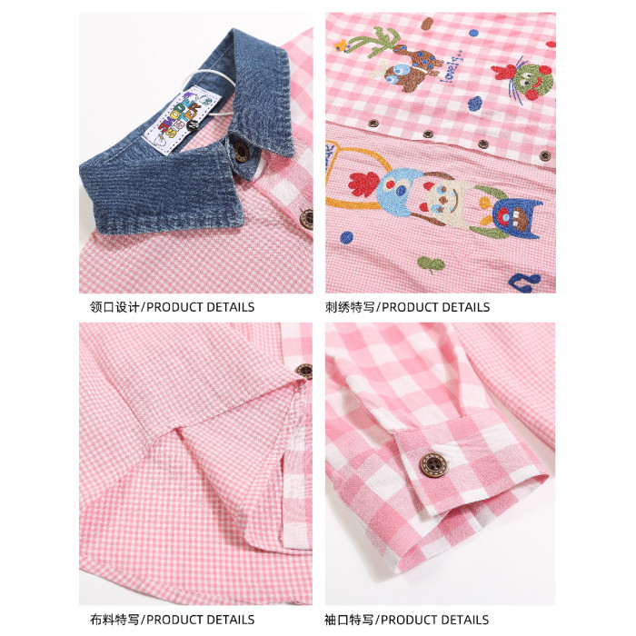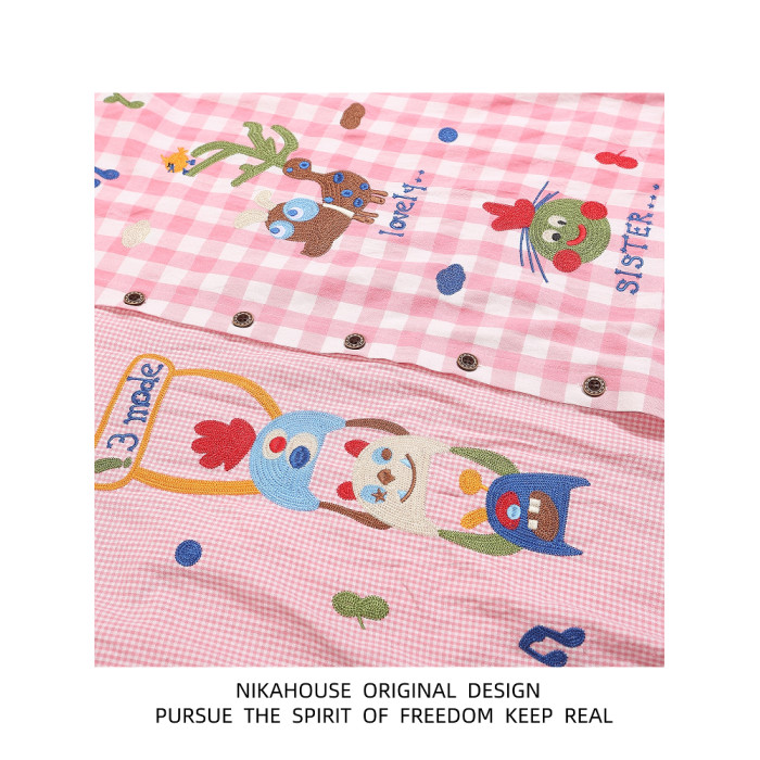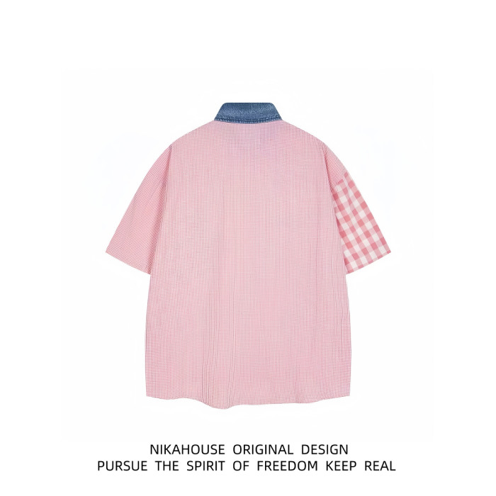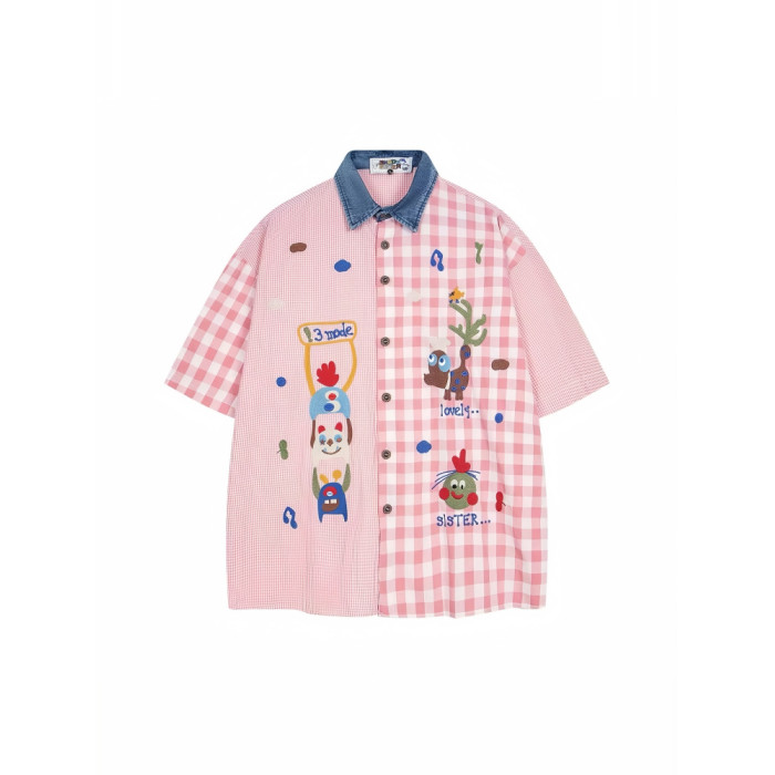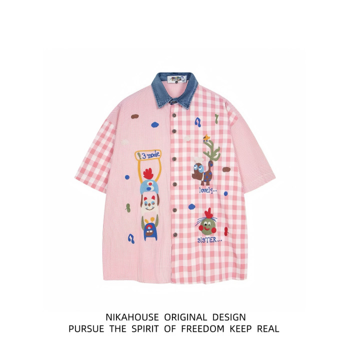NIKAHOUSE復古可愛小惡魔卡通刺綉短袖襯衫牛仔領拼接潮牌襯衣