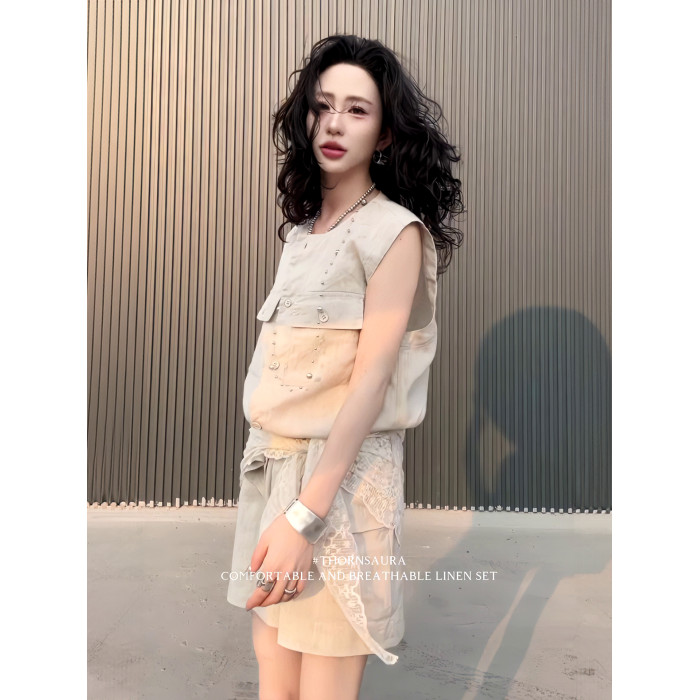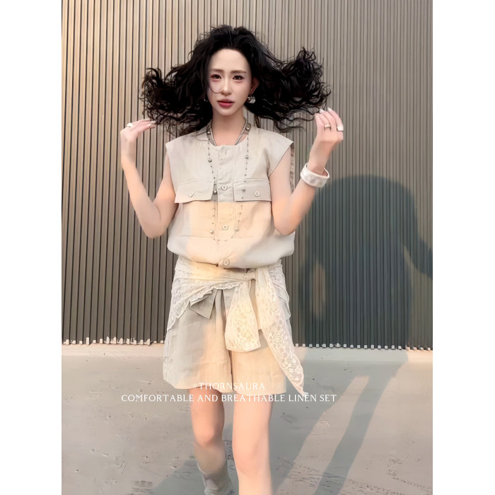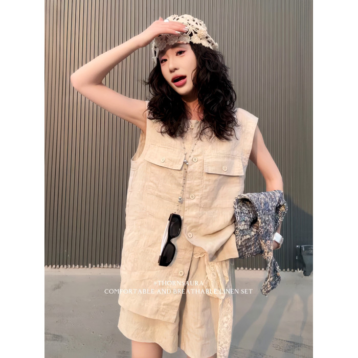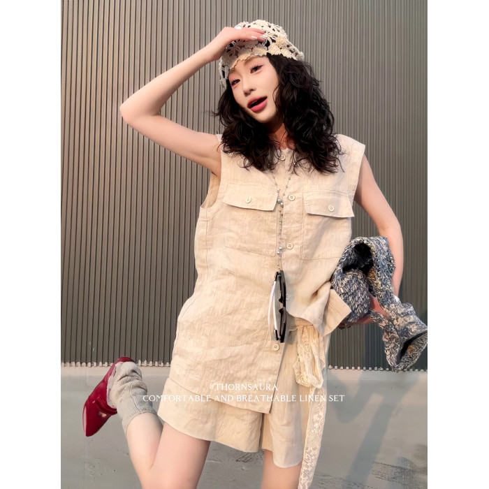 2025夏季新款復古設計感口袋無袖亞麻襯衫高腰休閒濶腿短褲套裝女