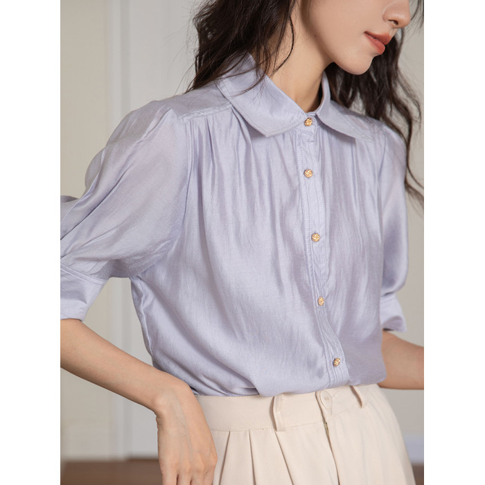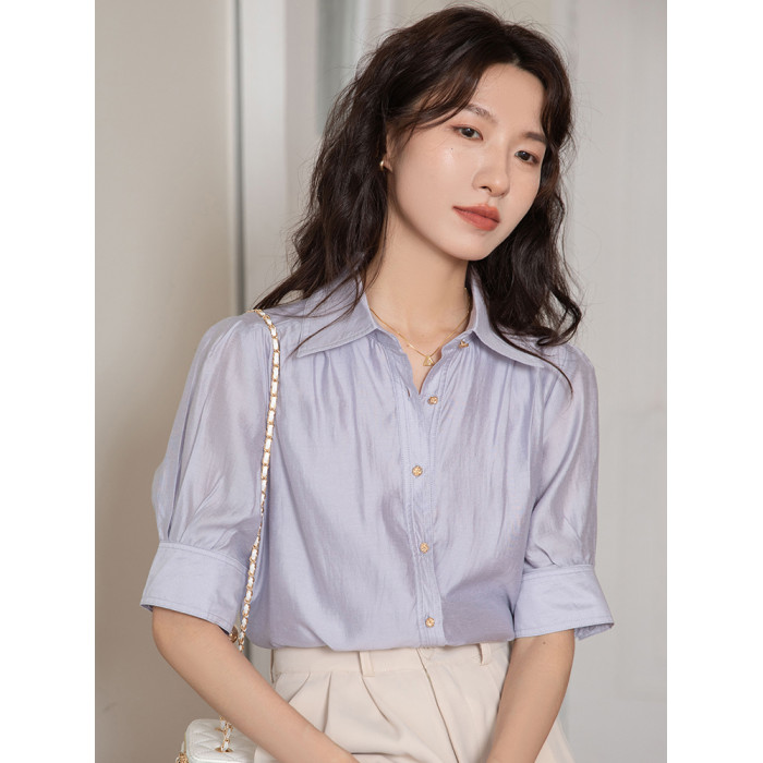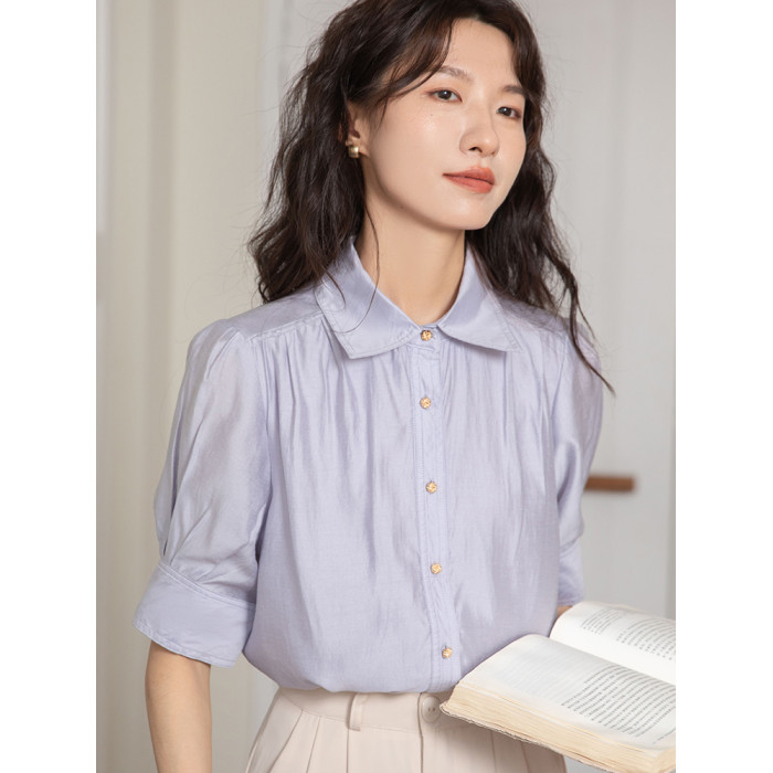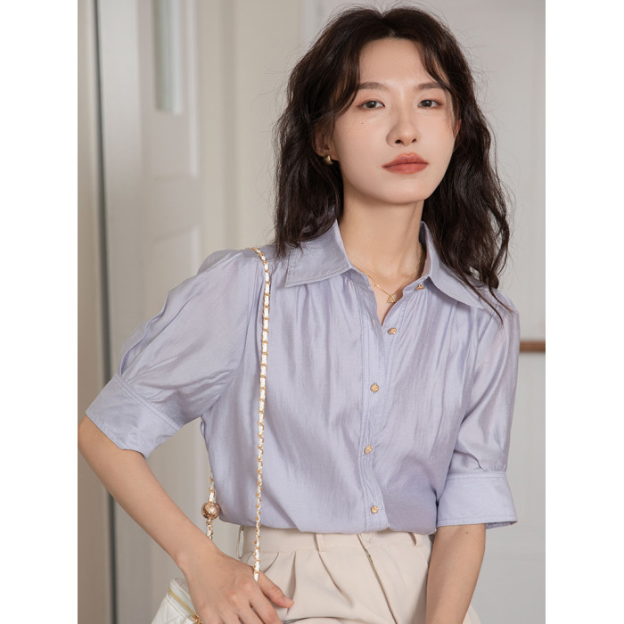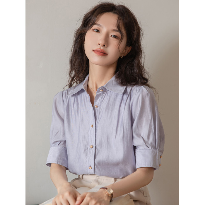 法式天絲棉淡紫色襯衫女短袖2025夏季通勤職業面試正裝泡泡袖上衣
