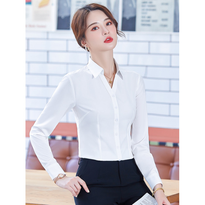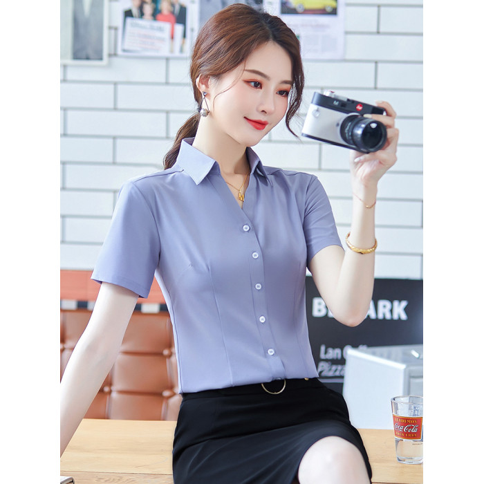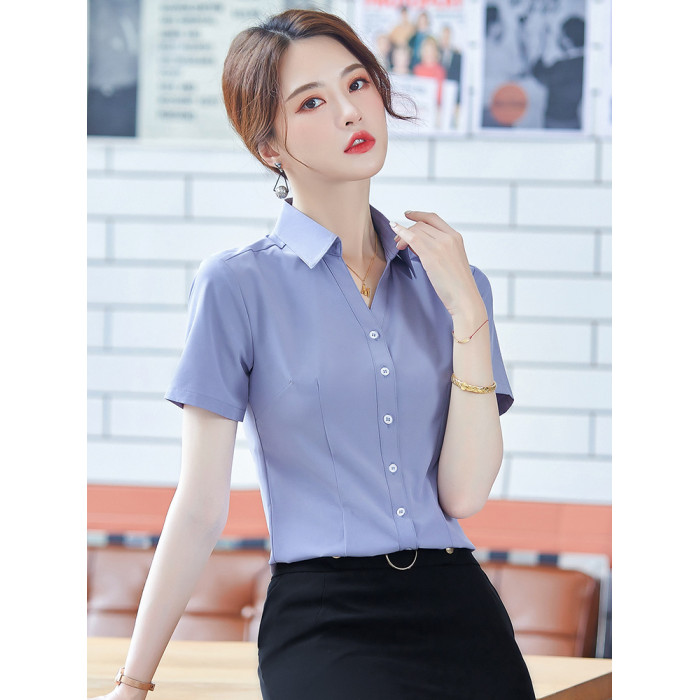 職業襯衫女短袖夏季2025新款修身白色V領襯衣正裝酒店前台工作服