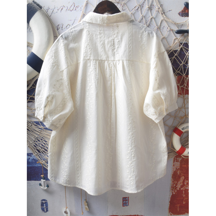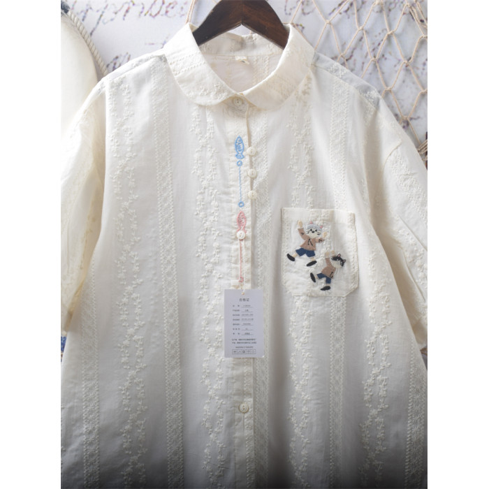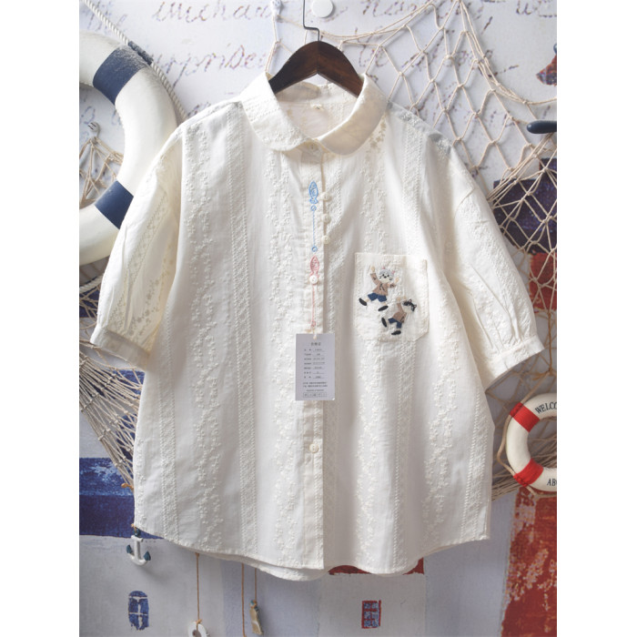 日系軟妹花藤麥穗刺綉短袖襯衫女彼得潘娃娃領前短後長小個子上衣