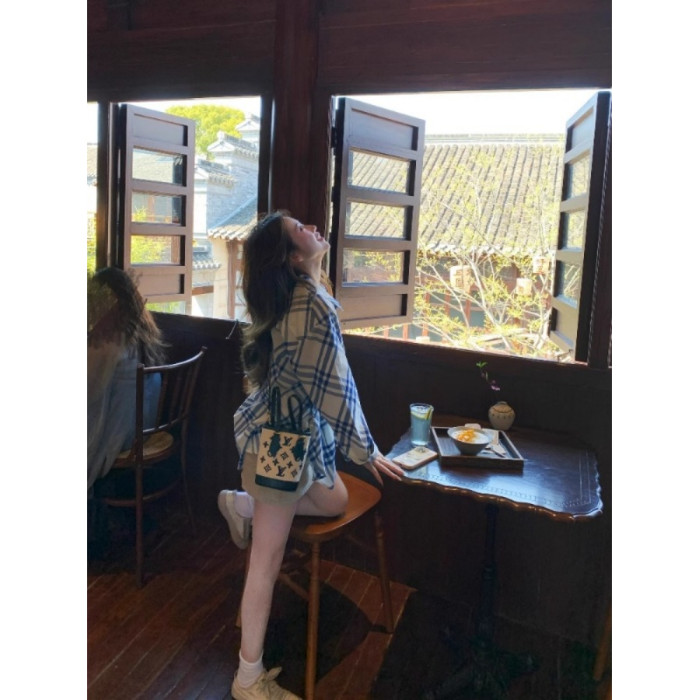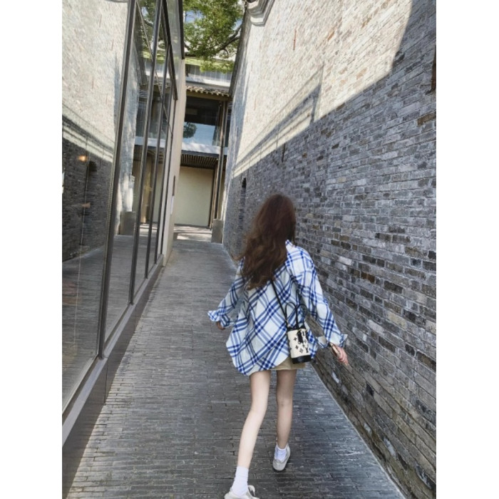 藍白撞色格紋襯衫女士2025夏季新款復古港風寬松薄款防曬長袖小衫