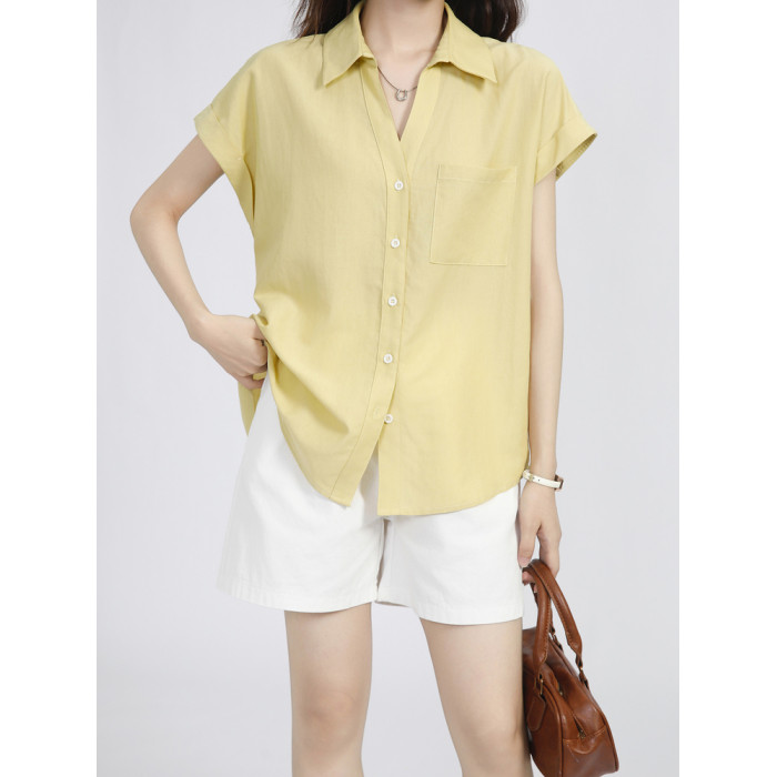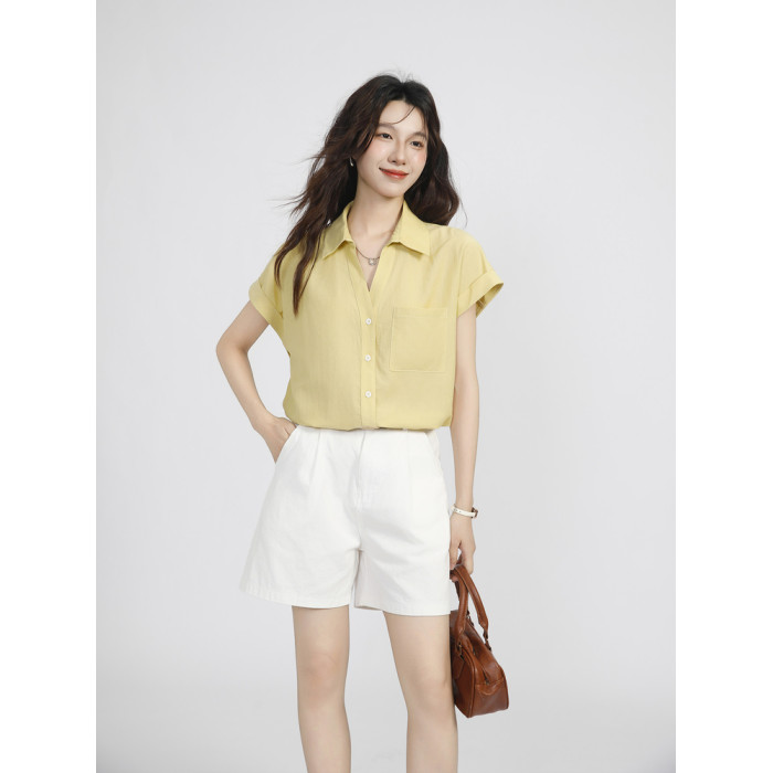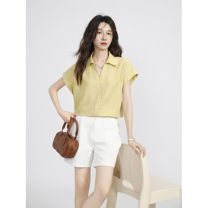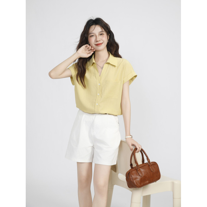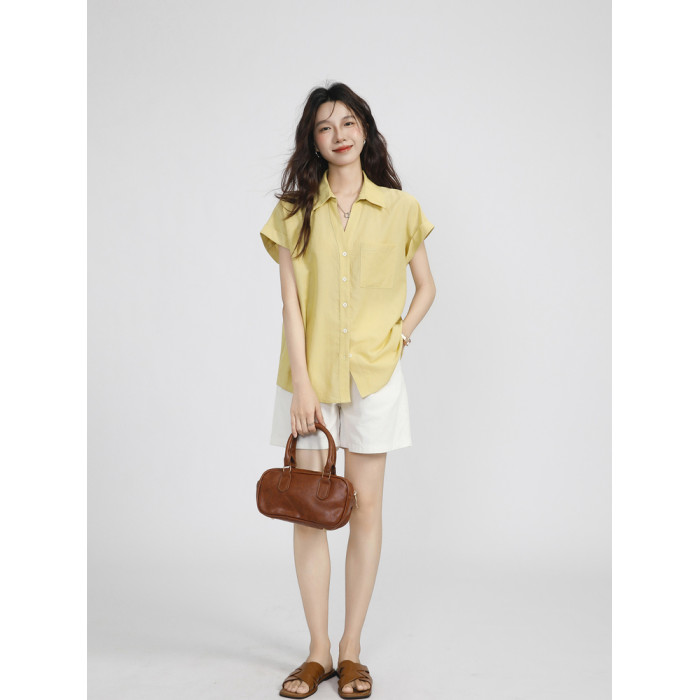 夏季薄款溫柔風黃色小飛袖襯衫女2025新款慵懶感百搭翻領短袖上衣