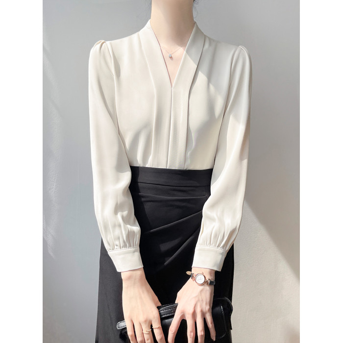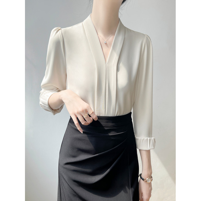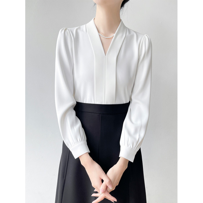 韓帛雅2025年春秋新款長袖V領襯衫女通勤職業面試襯衣高級感上衣