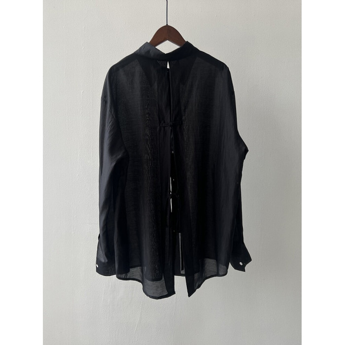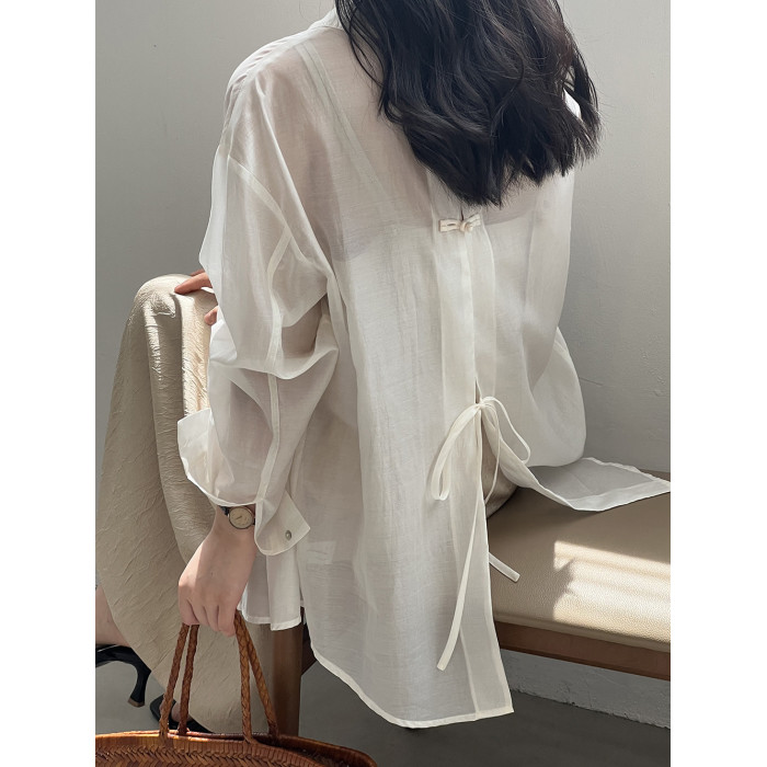 後背盤釦天絲襯衫女夏薄紗防曬珠光透視露背開叉上衣吊帶外搭開衫