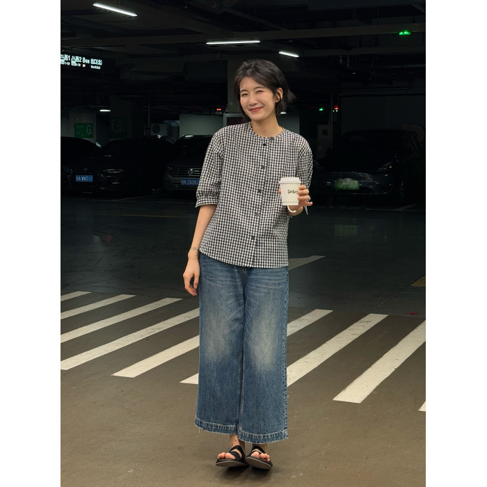 浪清格子襯衫女早秋2025新款寬松五分袖上衣女獨特超好看別致小衫