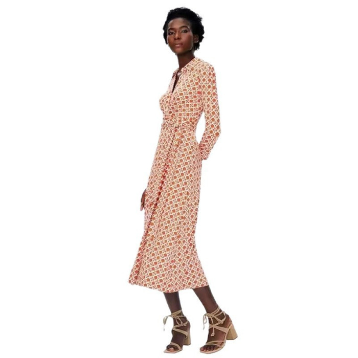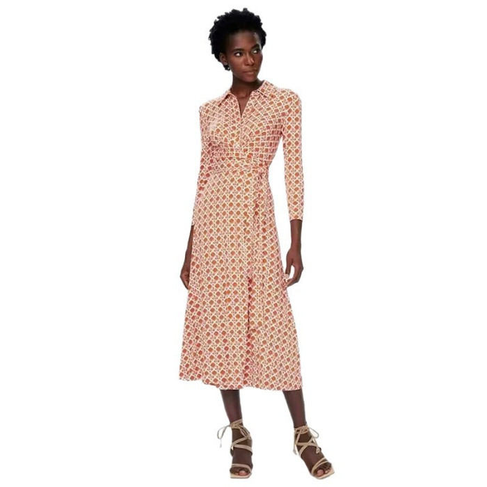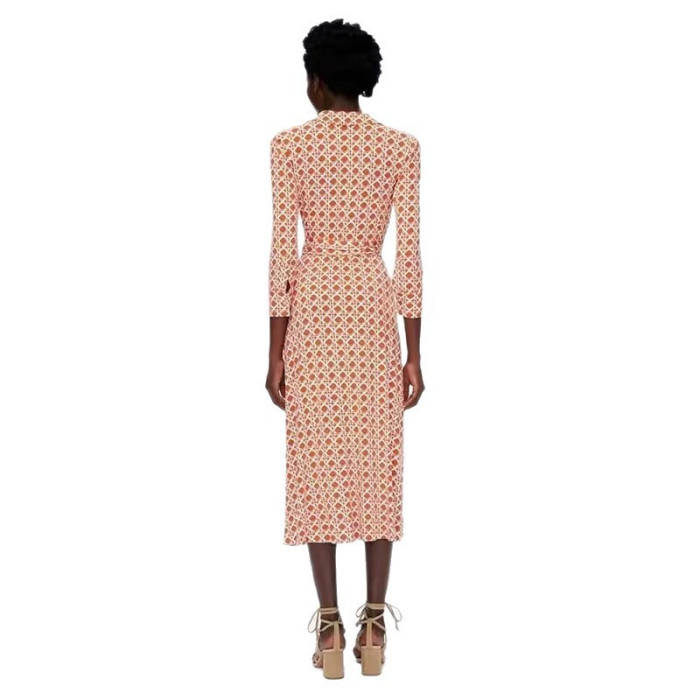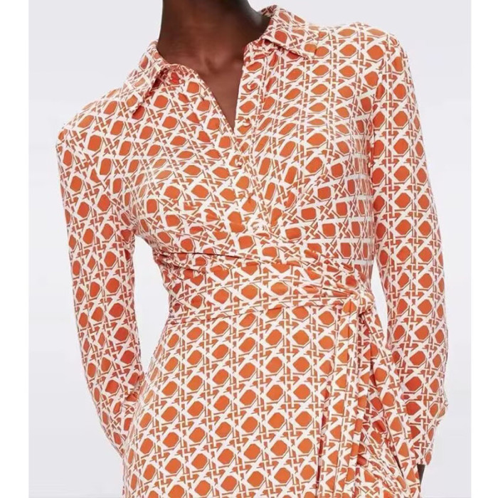 PG DVF夏季新款蜜橘色藤編格子襯衫式裹身裙浪漫優雅高腰系帶大擺