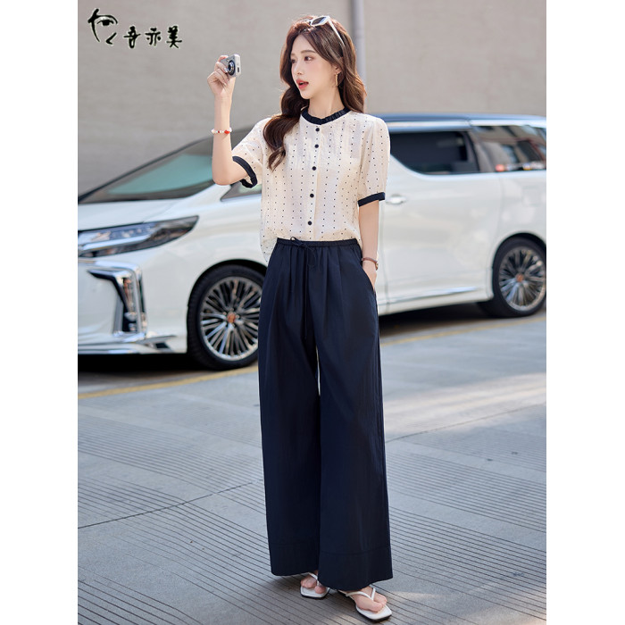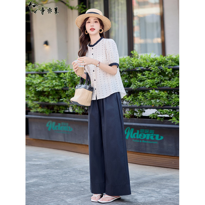 獨特漂亮夏裝兩件套女洋氣法式波點襯衫休閒濶腿褲套裝40整套穿搭