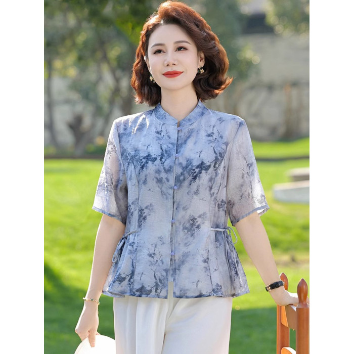 媽媽夏裝雪紡短袖襯衫上衣服中老年女夏季碎花T恤小衫兩件套