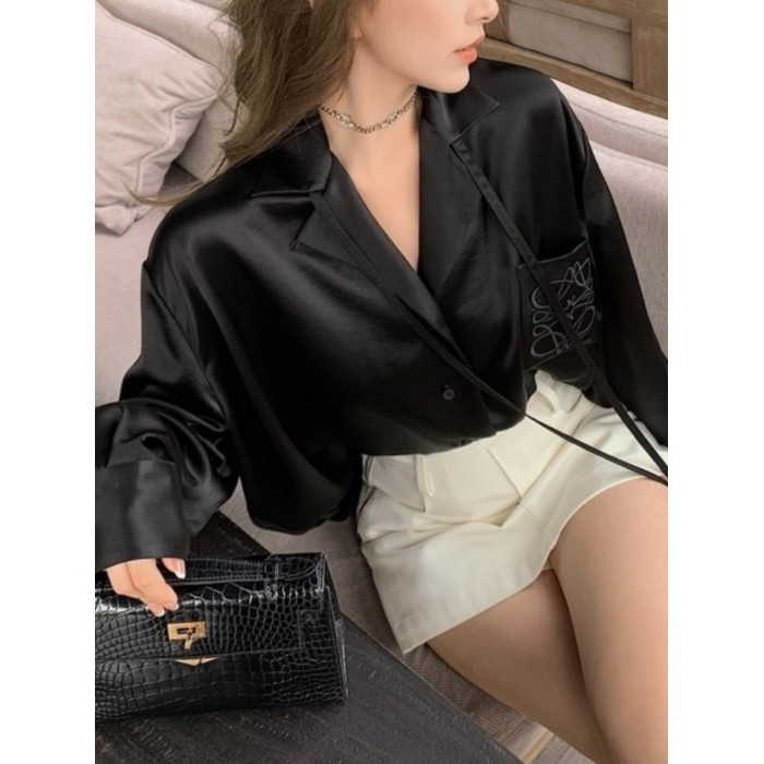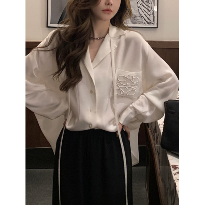 高級感醋酸緞面襯衫春秋寬松顯瘦法式別致刺綉白色襯衣女長袖上衣