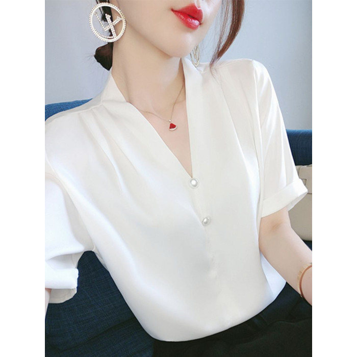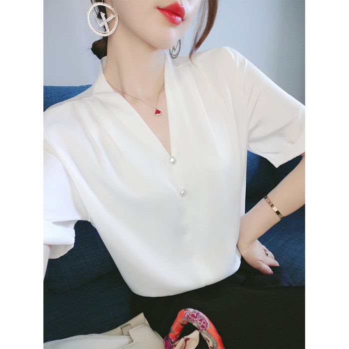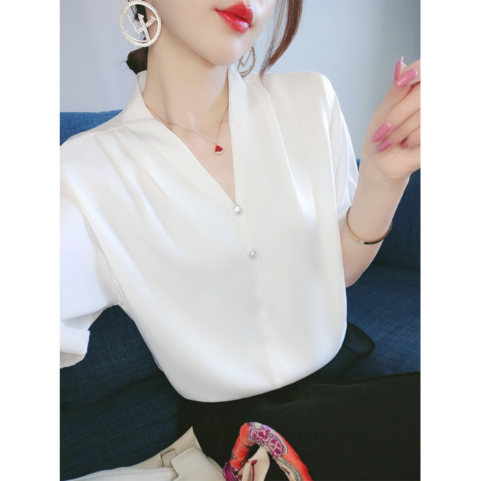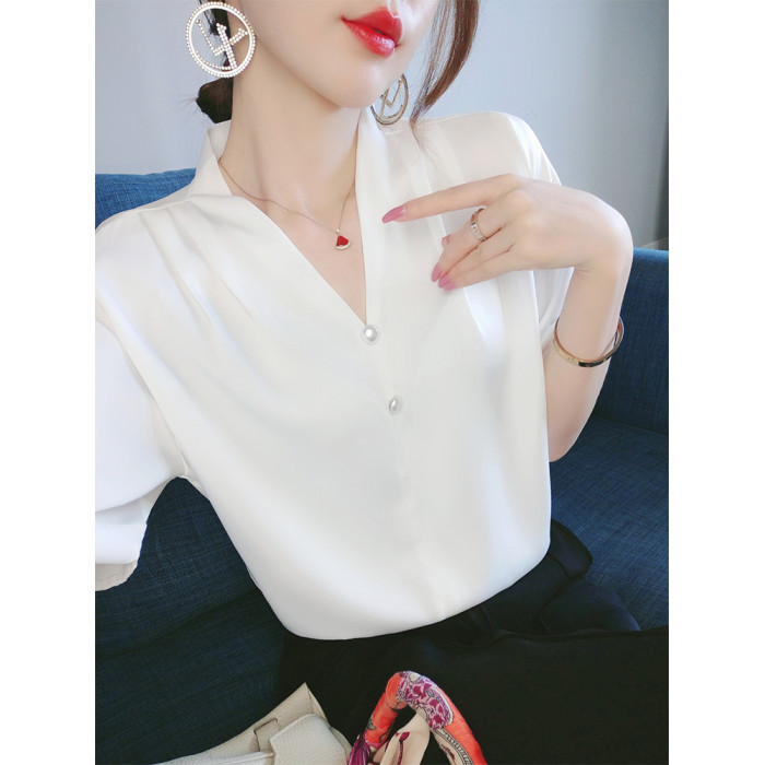 白色緞面雪紡襯衫女短袖夏裝大碼寬松設計感小衆內搭氣質襯衣上衣