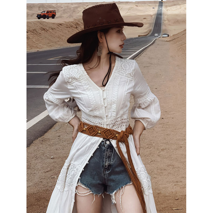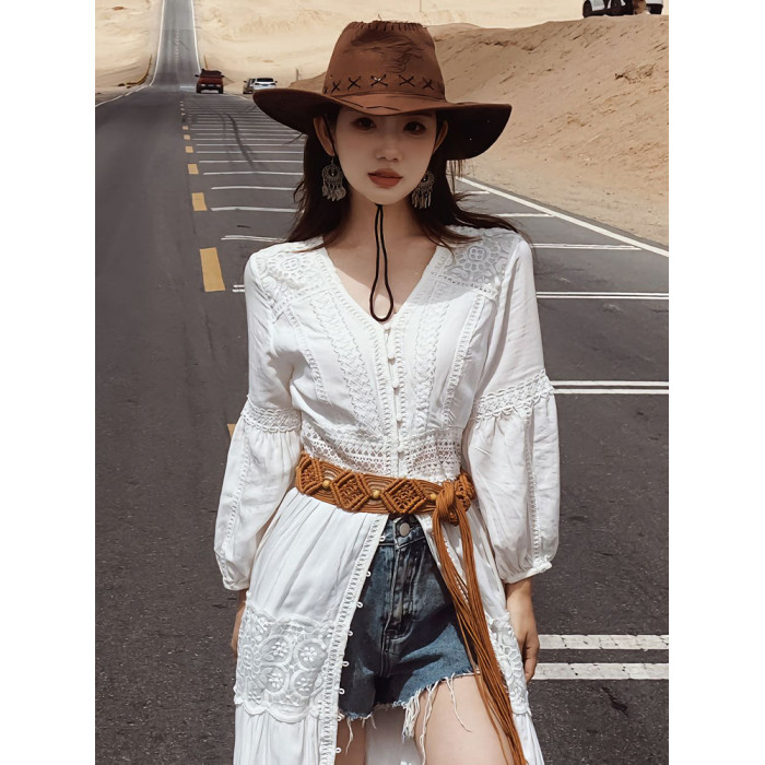 西北新疆沙漠旅行度假穿搭法式蕾絲拼接白色長款襯衫連衣裙女開叉
