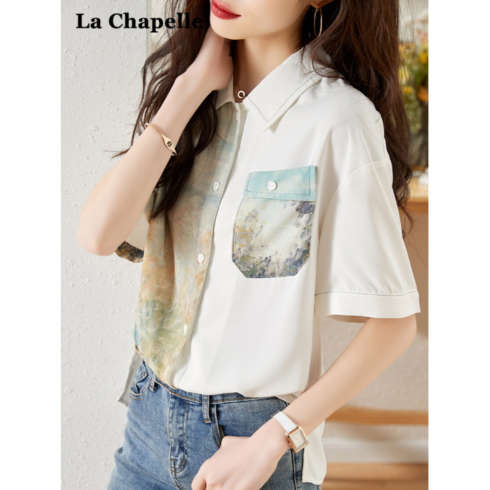 拉夏貝爾官方撞色印花短袖襯衫女2025夏季新款襯衣時尚設計感上衣