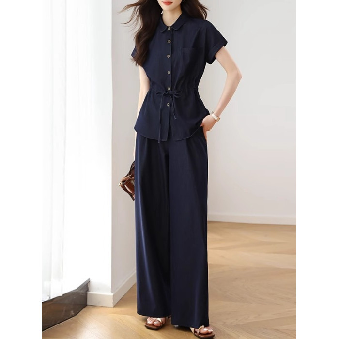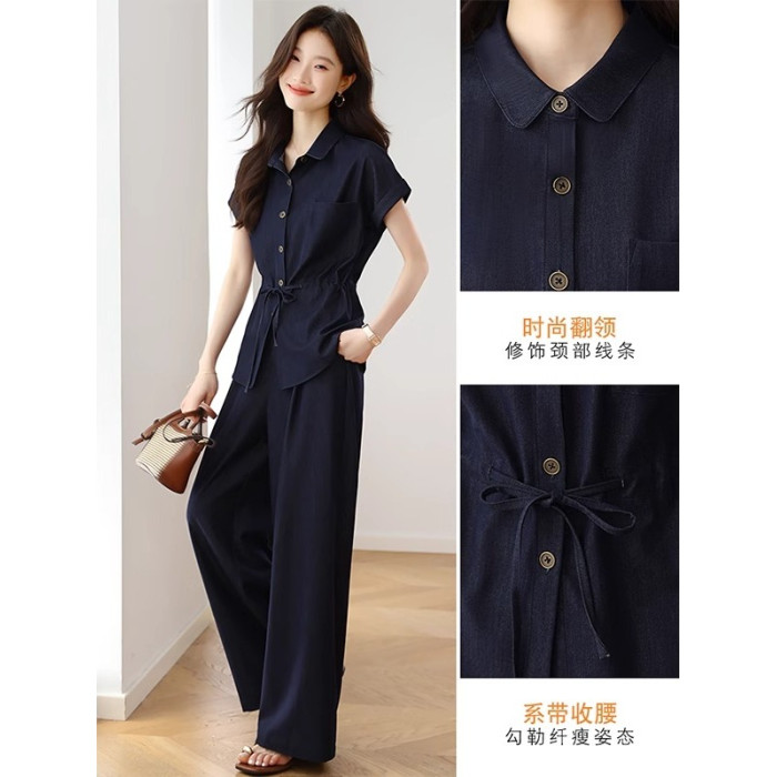 時尚套裝女夏季2025新款休閒氣質高級感減齡短袖襯衫濶腿褲兩件套