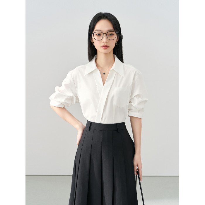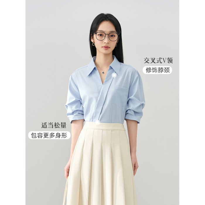 伯德小姐白色V領襯衫女士夏季面試穿搭通勤正裝短袖上衣職業襯衣