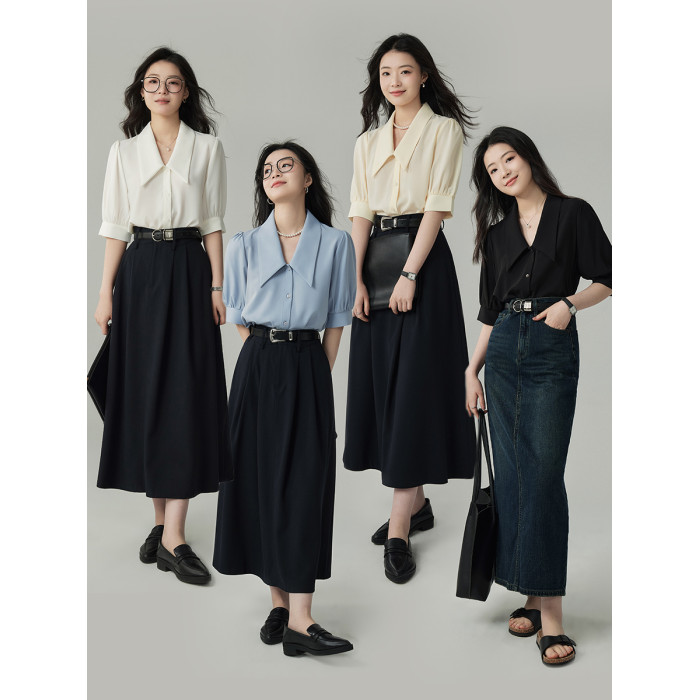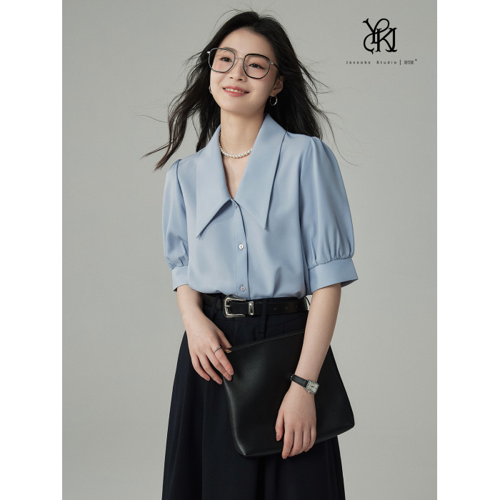 婭可家藍色襯衫女夏設計感小衆法式休閒氣質尖領短袖通勤百搭上衣