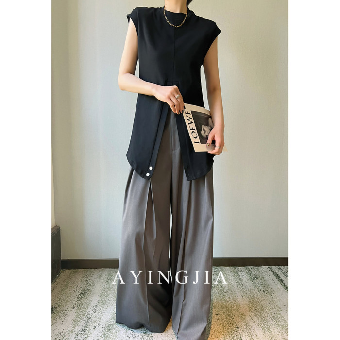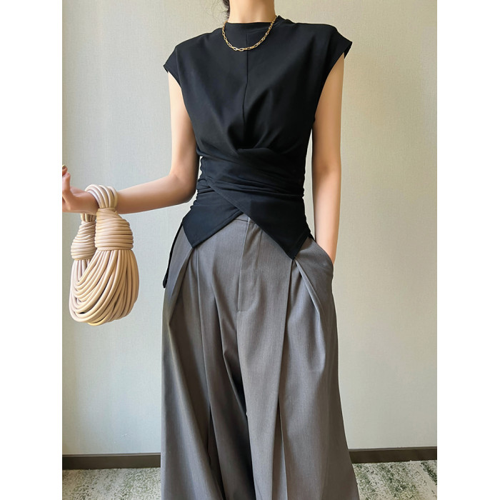 AYINGJIA 老錢襯衫女交叉紐結襯衣黑色通勤寬松氣質無袖小衆上衣
