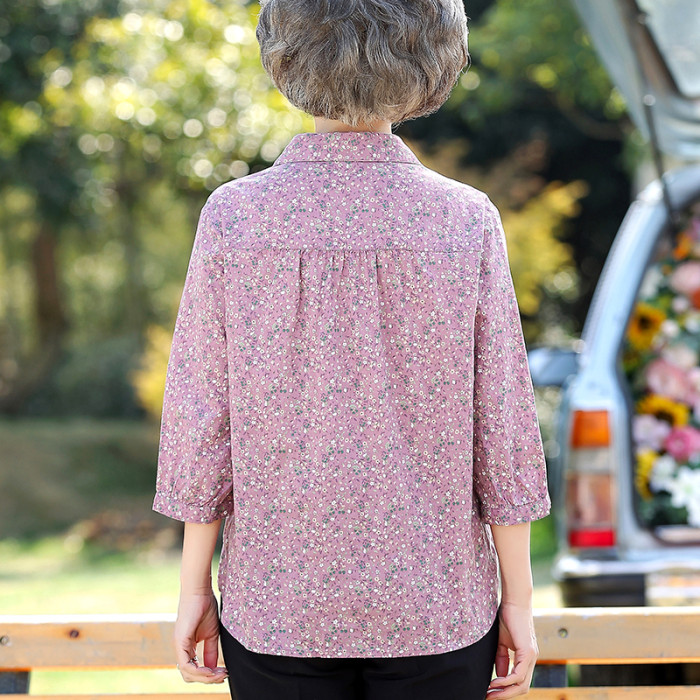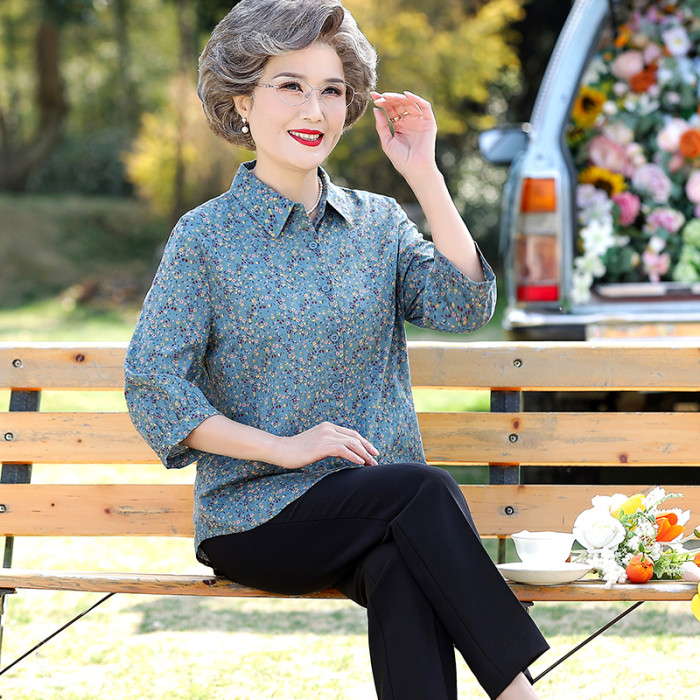 100%純棉襯衫女中老年人媽媽夏裝襯衣服套裝60嵗70奶奶七分袖上衣