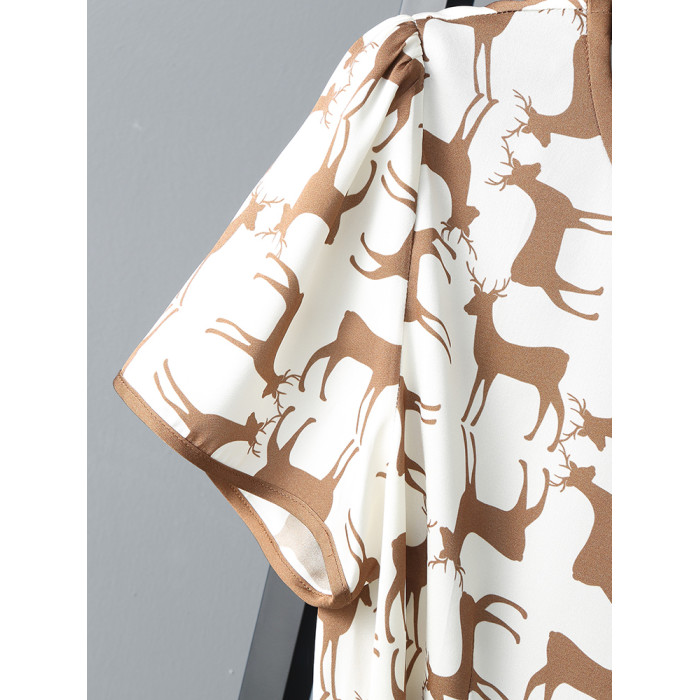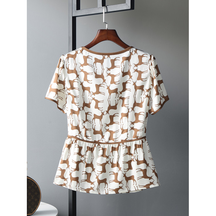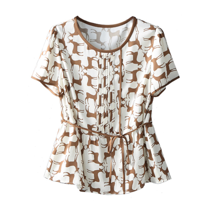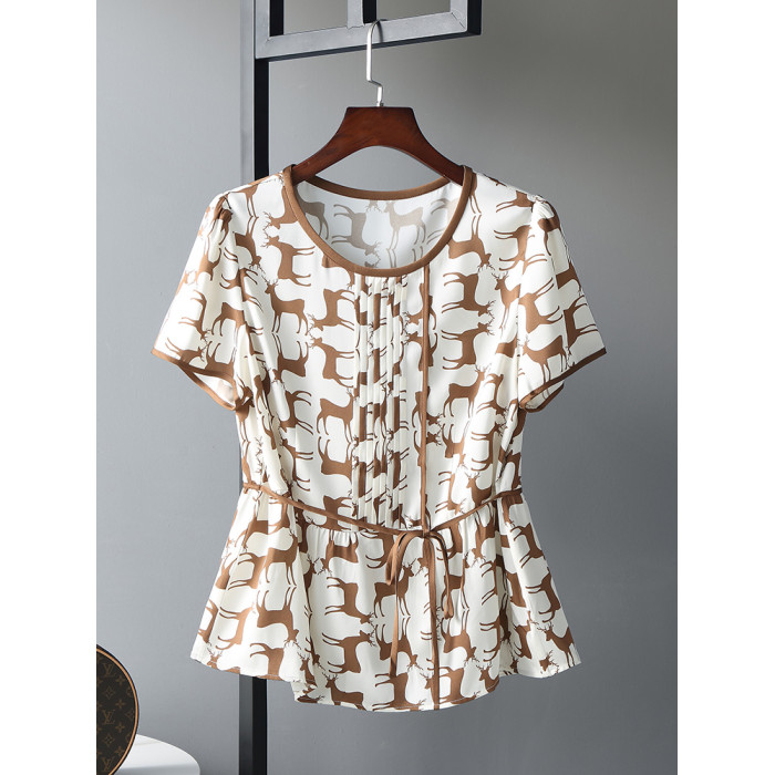 真絲T恤上衣女2025夏裝新款短袖收腰顯瘦小衫桑蠶絲圓領印花襯衫