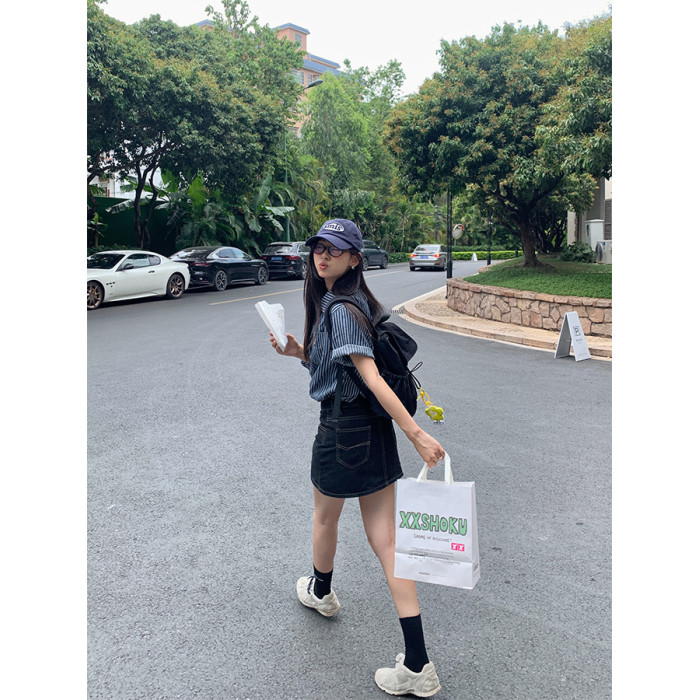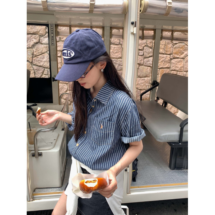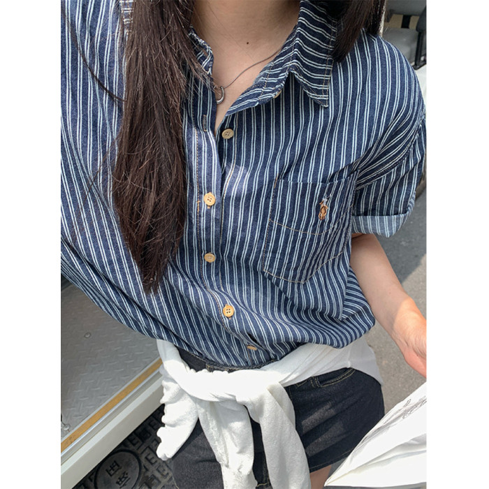 小7家 ins竪條紋口袋刺綉短袖襯衫2025夏休閒復古百搭牛仔襯衣女