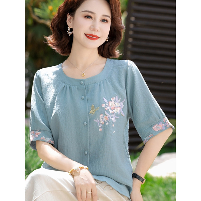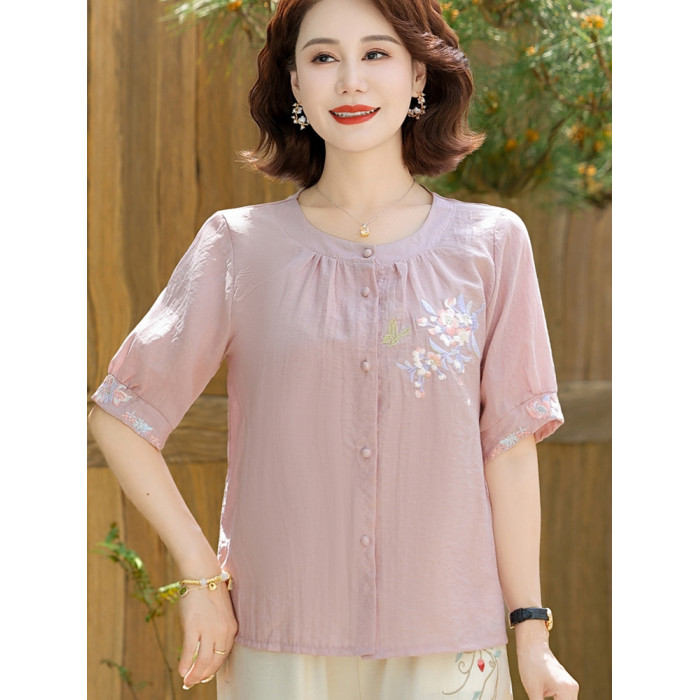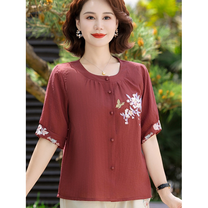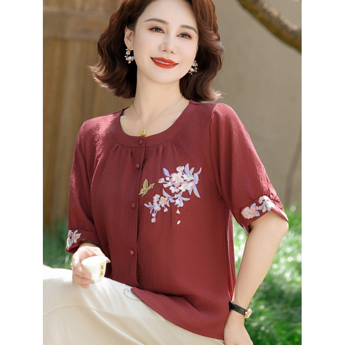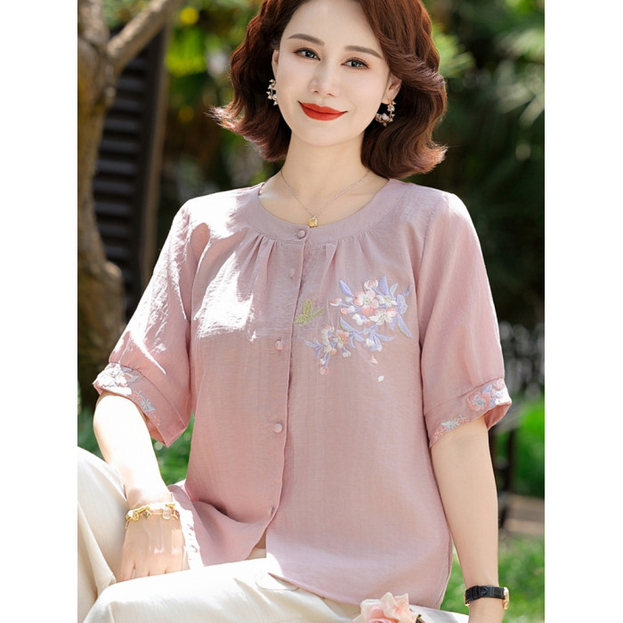 中年女士夏裝棉綢套裝媽媽裝襯衫上衣中老年人夏季純棉麻T恤短袖