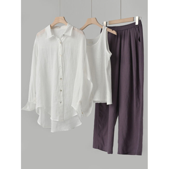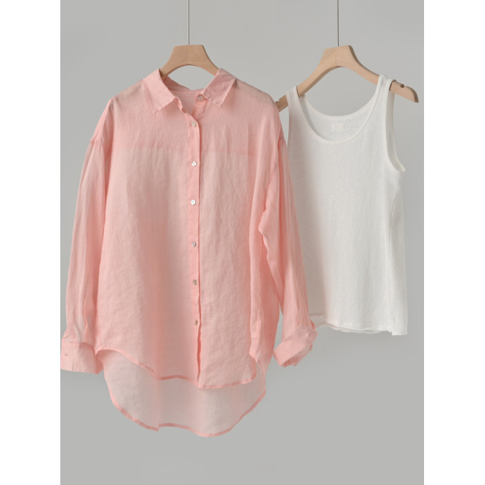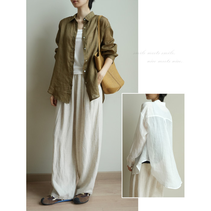 100支全苧麻 女士薄款長袖襯衫 寬松版翻領襯衣 遮陽外套夏款女裝